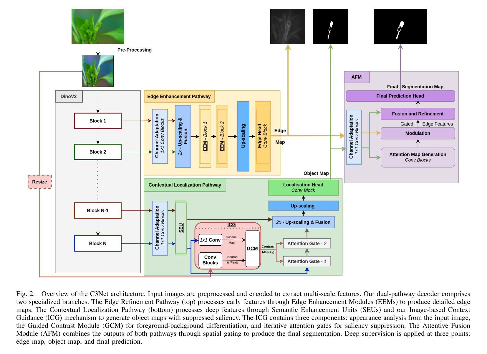 - C3Net通过专业化的双路径解码器架构解决所有挑战。