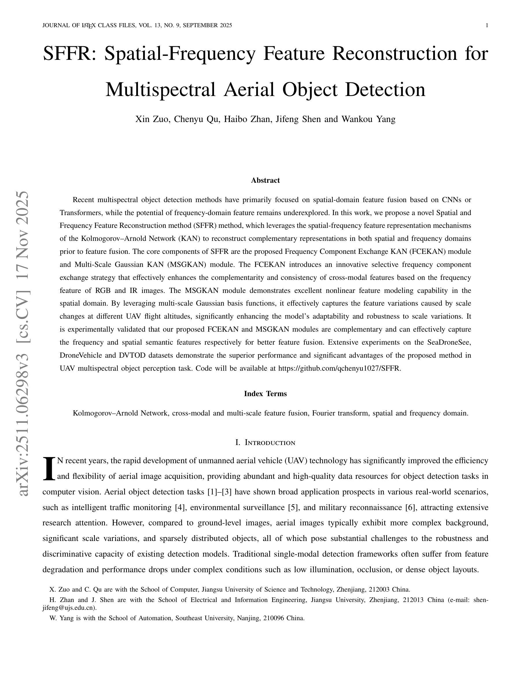 本文提出了一种新型的多光谱目标检测方法——空间与频率特征重建方法(SFFR)。该方法利用Kolmogorov-Arnold网络(KAN)的空间频率特征表示机制,在空间和频率域进行特征融合前的特征重建。核心模块包括频率分量交换KAN(FCEKAN)和多尺度高斯KAN(MSGKAN)。FCEKAN通过创新的频率分量选择性交换策略,增强了跨模态特征的互补性和一致性。MSGKAN模块在空间中表现出卓越的非线性特征建模能力,通过多尺度高斯基础函数捕捉不同无人机飞行高度引起的特征变化,增强了模型对尺度变化的适应性和稳健性。实验证明,FCEKAN和MSGKAN模块互补性强,能有效捕捉频率和空间语义特征,从而提高无人机多光谱目标感知任务的效果。