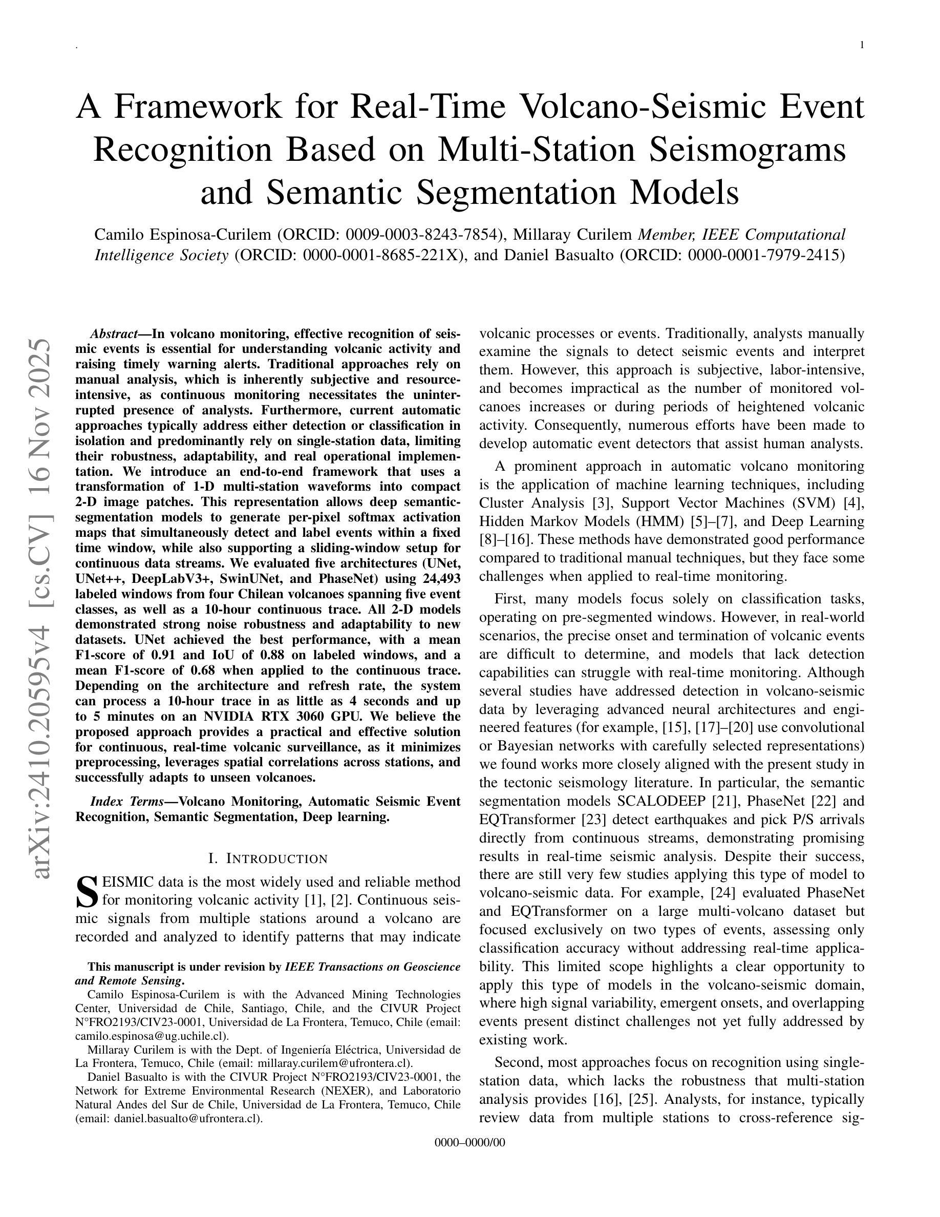 Summary:该研究采用语义分割模型,通过直接将多通道一维信号转化为二维图像表示,实现了地震事件的自动识别。该研究采用数据驱动的端到端设计,整合多站地震数据,最小限度预处理,同时完成检测和分类五个地震事件类别。在智利四个不同火山的地震事件数据上评估了四种最先进的分割模型,其中UNet架构表现最佳,具有噪声鲁棒性和模型灵活性。