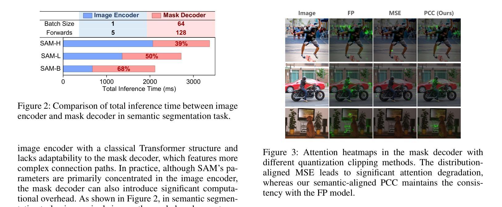 Segment Anything Model(SAM)展现出了卓越的零样本分割能力;然而,其高昂的计算成本使得边缘部署面临挑战。虽然后训练量化(PTQ)提供了一种有前景的压缩解决方案,但当将其应用于SAM时,现有方法产生的效果并不令人满意,原因在于SAM的专门模型组件和可提示的工作流程:(i)掩膜解码器的注意力表现出极端的激活异常值,我们发现,在不对其进行平滑或隔离的情况下,进行激烈裁剪(甚至是100倍)在抑制异常值的同时能维持性能。然而,传统的基于分布的度量(例如MSE)无法提供如此大规模的裁剪。(ii)现有的量化重建方法忽略了SAM的语义交互性,导致图像特征与提示意图之间的不匹配。为了解决上述问题,本文提出了SAQ-SAM,它从语义对齐的角度提升了SAM的后训练量化。具体来说,我们提出了感知一致性裁剪,它利用注意力焦点重叠来促进激烈裁剪,同时保留语义能力。此外,我们提出了提示感知重建,它通过利用掩膜解码器中的交叉注意力来结合图像提示交互,从而促进分布和语义的对齐。为了确保交互效率,我们还为编码器中的图像令牌设计了一种跳过策略。在多种SAM大小和任务上进行了广泛实验,包括实例分割、定向目标检测和语义分割,结果表明我们的方法具有一致性优势。例如,当将SAM-B量化至4位时,SAQ-SAM在实例分割任务中的mAP比基线高出11.7%。