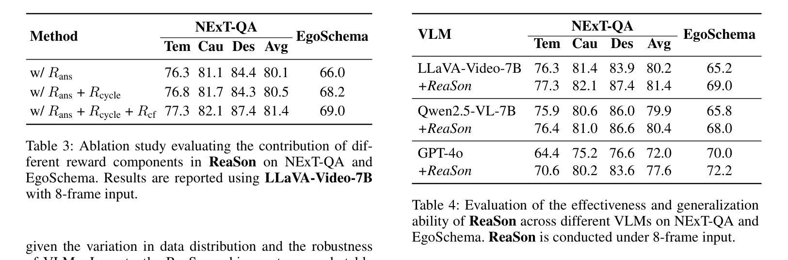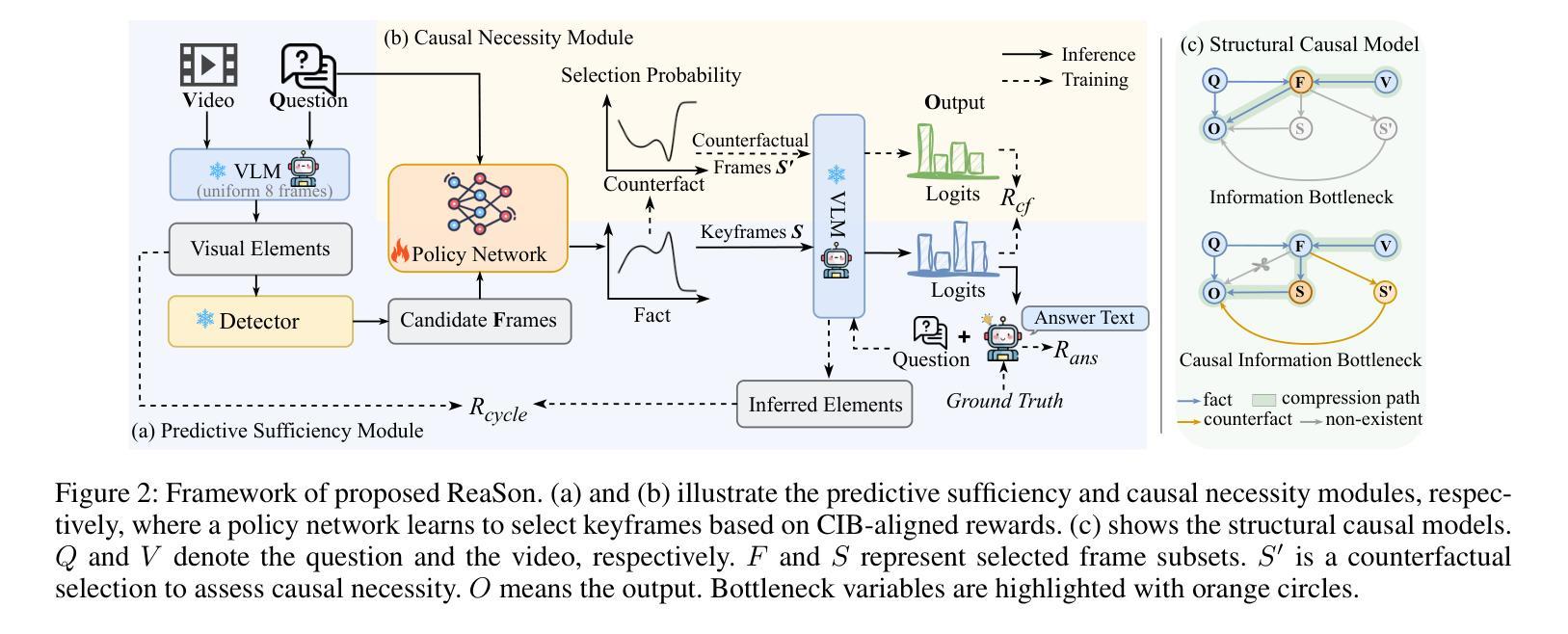 视频理解中,关键帧的选择对于视觉语言模型(VLMs)至关重要。面对有限的输入标记和跨视频帧的时空信息稀疏性,有效的关键帧不仅需要包含信息,还需要具有决定性的因果作用。为此,我们提出了基于信息瓶颈的强化因果搜索(ReaSon)框架,它将关键帧选择公式化为一个优化问题,并借助新颖的因果信息瓶颈(CIB)明确地将关键帧定义为同时满足预测充分性和因果必要性的帧。具体来说,ReaSon使用一个可学习的策略网络从视觉相关的候选帧池中选取关键帧,以捕捉预测充分性,然后通过反事实干预评估因果必要性。最后,设计了一个与CIB原则一致的复合奖励来通过强化学习引导选择策略。在NExT-QA、EgoSchema和Video-MME上的广泛实验表明,在有限帧设置下,ReaSon始终优于现有最先进的方法,验证了其有效性和泛化能力。