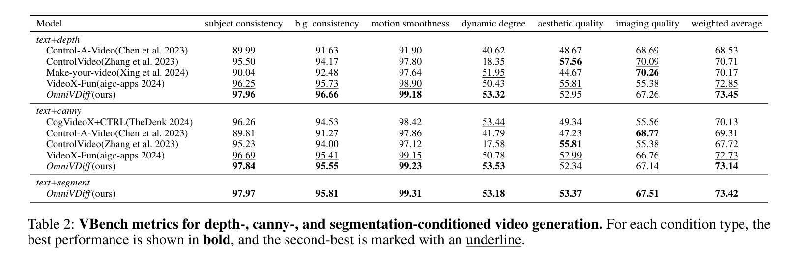 - 实验表明,OmniVDiff在视频生成任务上表现优秀,并在视频理解方面取得有竞争力的结果。