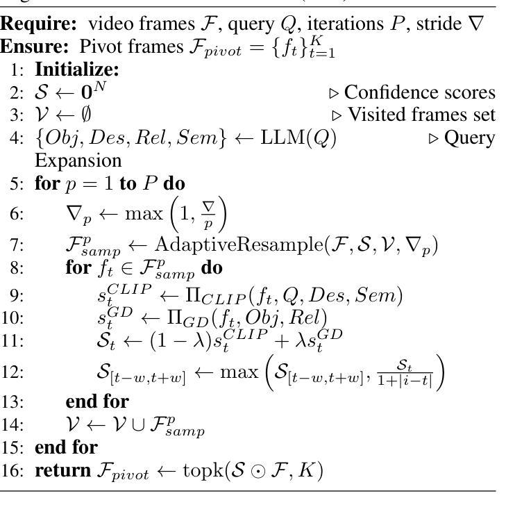 - 枢轴帧检索采用查询扩展和迭代时空语义置信度评分来识别相关视频帧。