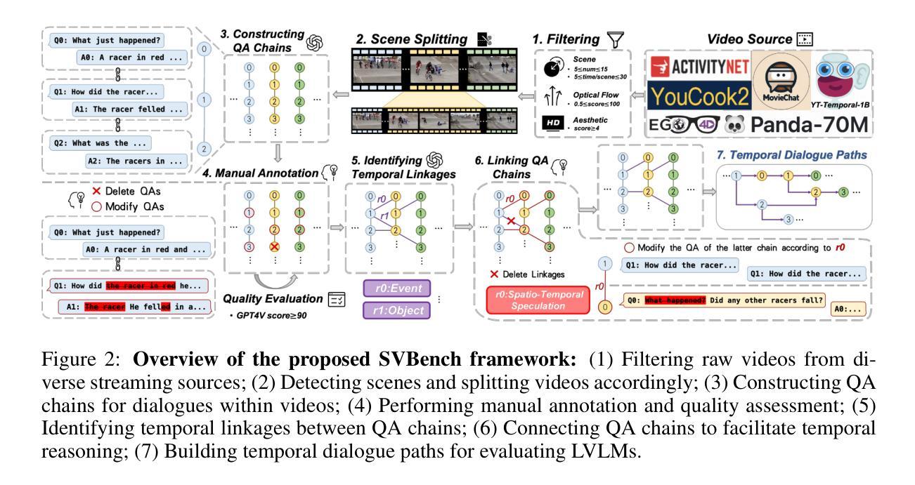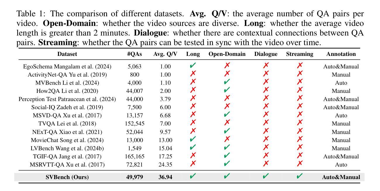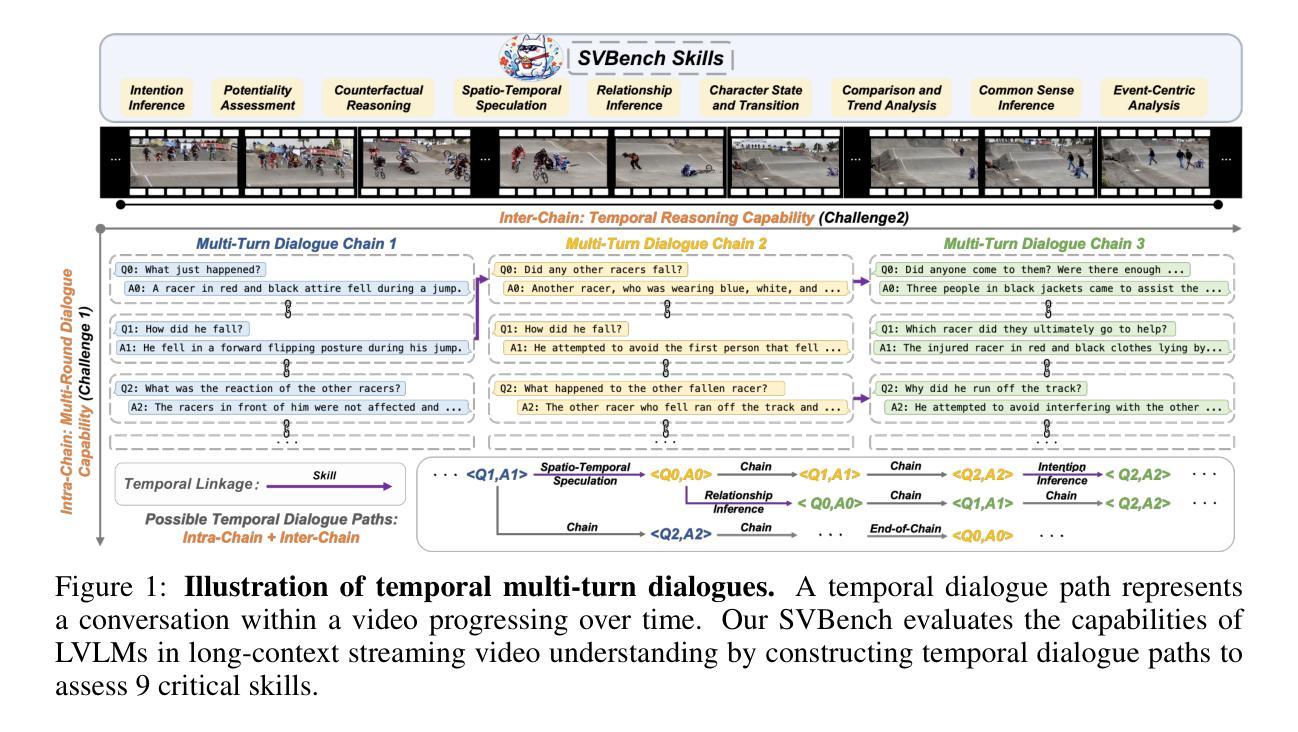 - SVBench通过设计包含连续多轮对话的视频片段问答链,强调对视频流全程的推理能力评估。