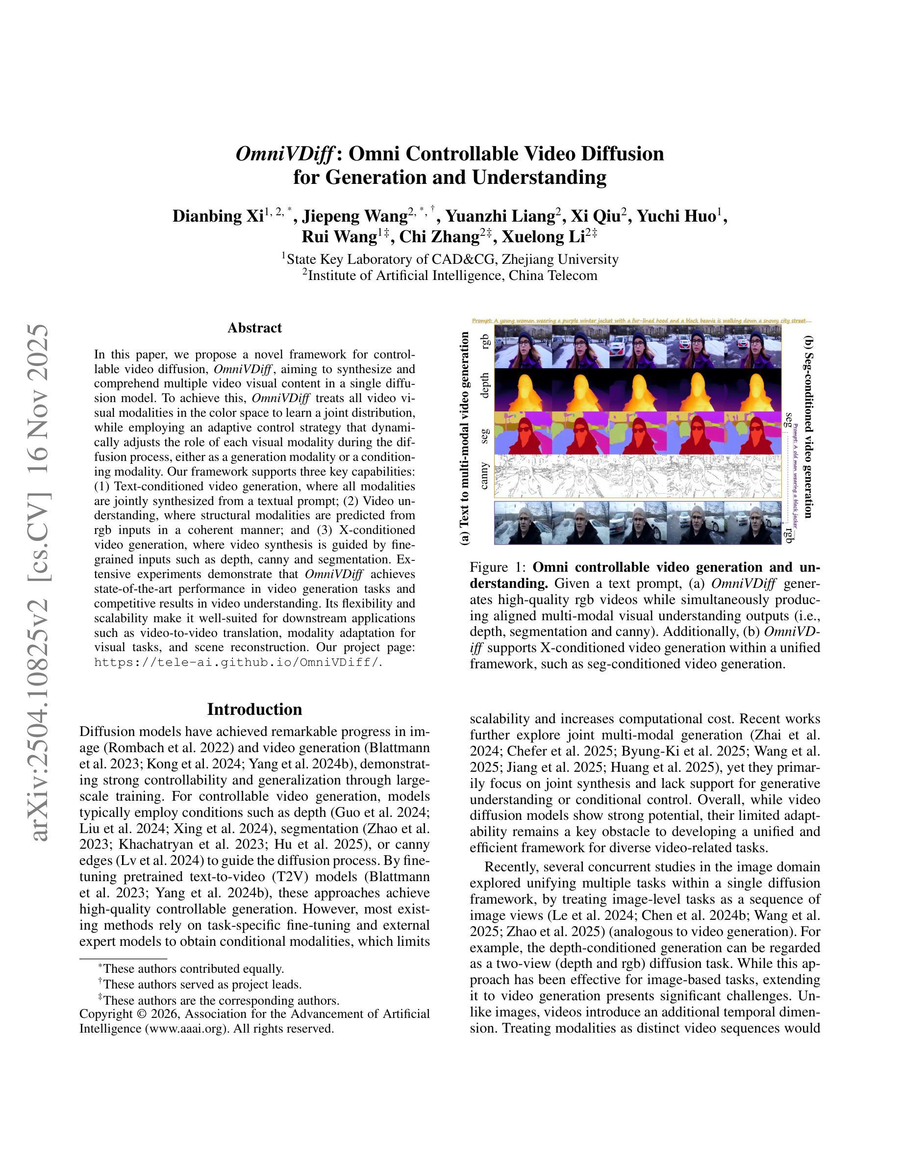 本文提出了一种新的可控视频扩散框架,名为OmniVDiff,旨在在一个单一的扩散模型中合成和理解多个视频视觉内容。为实现这一目标,OmniVDiff处理彩色空间中的所有视频视觉模式来学习联合分布,同时采用自适应控制策略,在扩散过程中动态调整每种视觉模式的作用,既可以作为生成模式,也可以作为条件模式。我们的框架支持三种关键功能:(1)文本控制视频生成,其中所有模式都从一个文本提示中联合合成;(2)视频理解,其中结构模式以连贯的方式从RGB输入中进行预测;(3)X控制视频生成,其中视频合成由深度、Canny和分段等精细输入引导。大量实验表明,OmniVDiff在视频生成任务上达到了最新技术水平,并在视频理解方面取得了有竞争力的结果。其灵活性和可扩展性使其非常适合下游应用,如视频到视频的翻译、视觉任务的模态适应和场景重建。