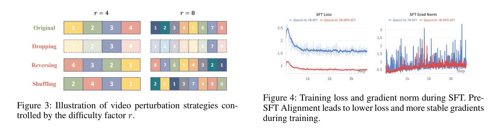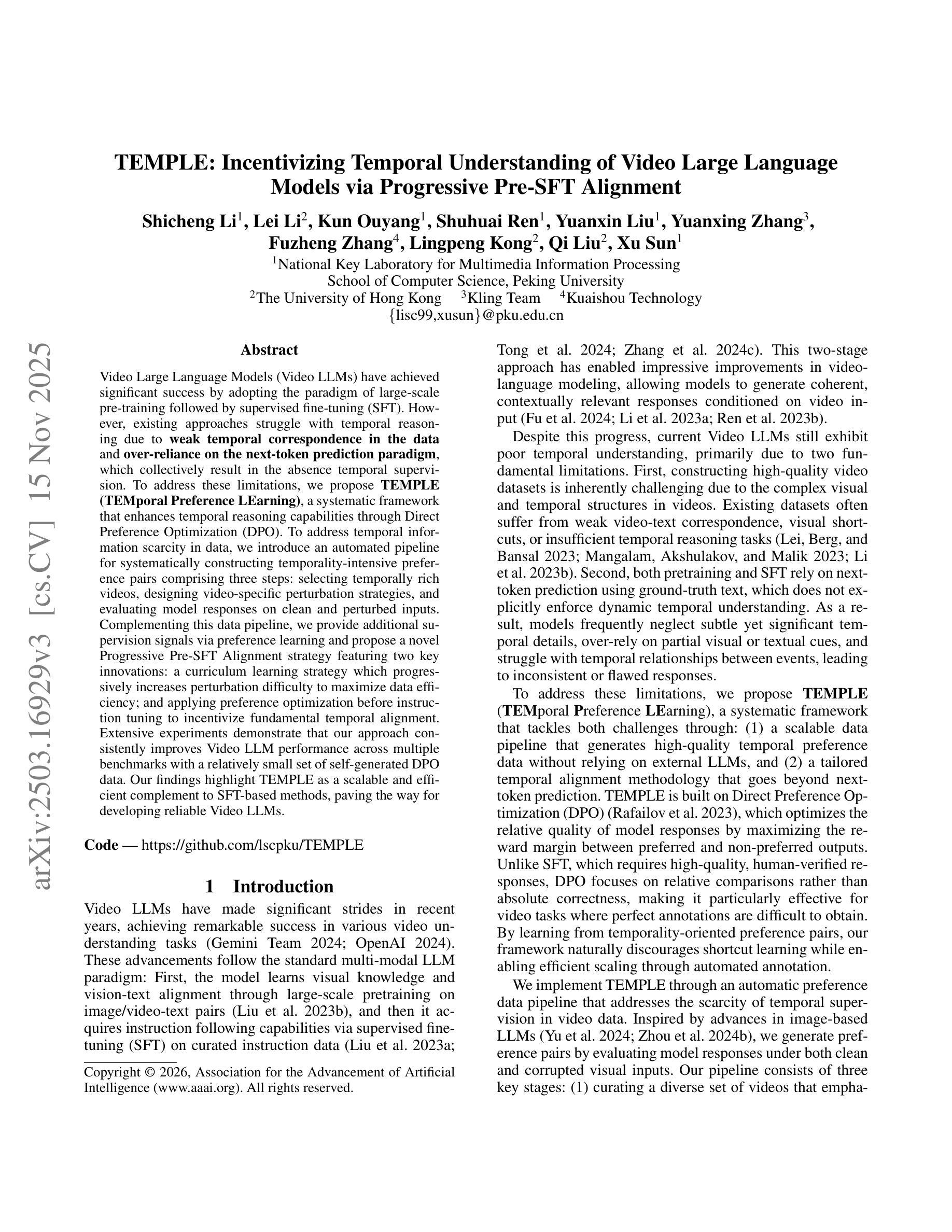 视频大型语言模型(Video LLMs)通过采用大规模预训练后结合监督微调(SFT)的模式取得了巨大成功。然而,现有方法由于数据中的时间对应性较弱以及对下一个令牌预测模式的过度依赖,从而在时间推理方面遇到了困难,这些因素共同导致了时间监督的缺失。为了克服这些局限性,我们提出了TEMPLE(时空偏好学习)系统框架,它通过直接偏好优化(DPO)增强时间推理能力。为解决数据中时间信息匮乏的问题,我们引入了一个自动化管道,用于系统地构建包含三个步骤的时间密集偏好对:选择时间丰富的视频、设计针对视频的扰动策略,并在干净和受干扰的输入上评估模型响应。补充这一数据管道的同时,我们通过偏好学习提供额外的监督信号,并提出一种新型渐进式Pre-SFT对齐策略,其中包括两个关键创新点:一种课程学习策略,逐步增加扰动难度以最大化数据效率;以及在指令调整之前应用偏好优化,以激励基本的时间对齐。大量实验表明,我们的方法在使用自我生成的少量DPO数据的情况下,能够在多个基准测试中持续提高视频LLM的性能。我们的研究结果表明,TEMPLE可以作为基于SFT的方法的可扩展和有效的补充,为开发可靠的视频LLM铺平了道路。