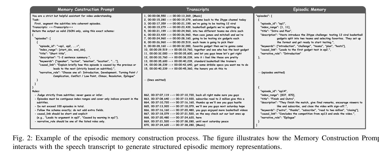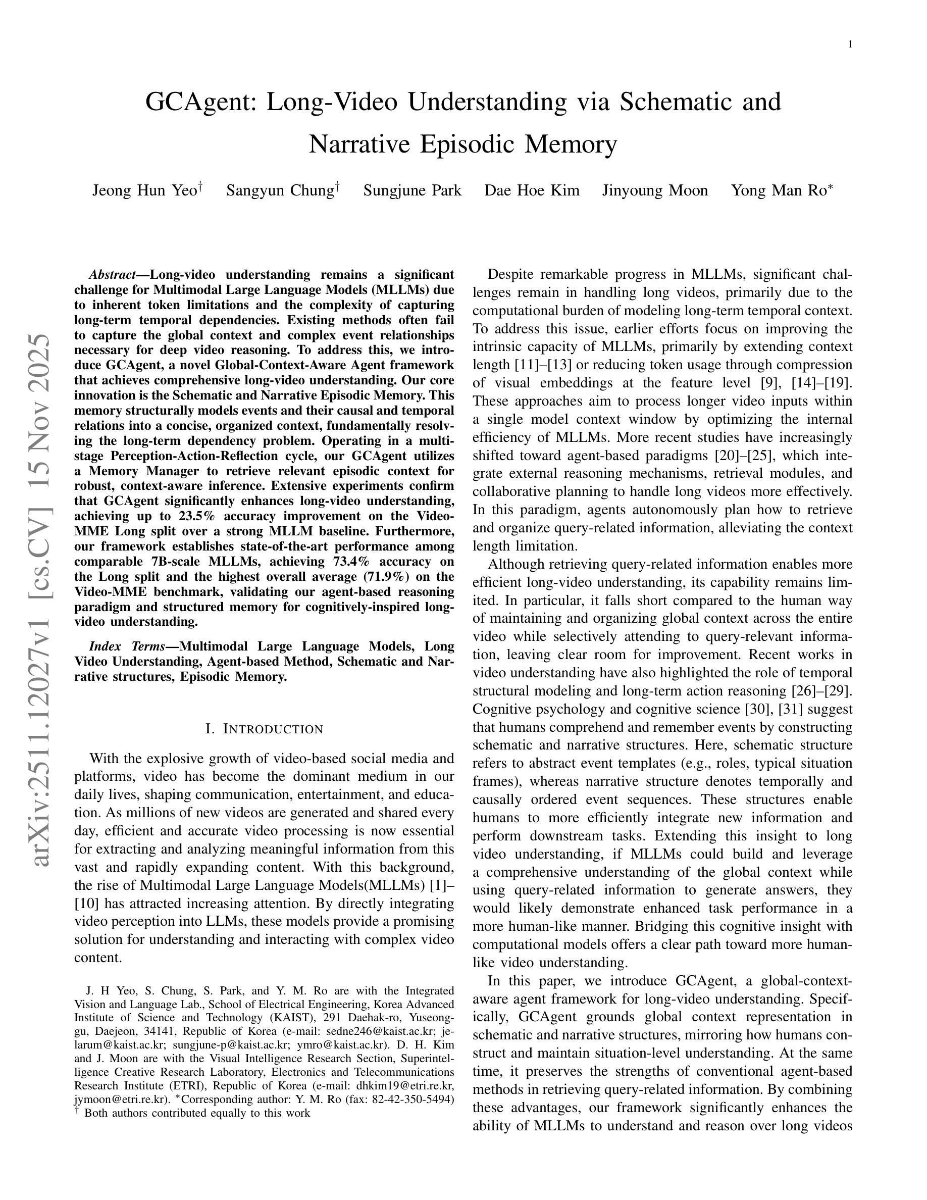 本文介绍了针对多模态大型语言模型(MLLMs)在处理长视频理解时面临的挑战,提出一种全新的全局上下文感知代理框架GCAgent,实现了全面的长视频理解。其核心创新是“图式叙事性情景记忆”,该记忆结构性地模拟事件及其因果和时间关系,以解决长期依赖问题。GCAgent在多阶段感知-行动-反思循环中运行,通过内存管理器检索相关情景上下文进行稳健的上下文感知推理。实验证明,GCAgent在Video-MME长分割上提高了高达23.5%的准确率,在可比的7B规模MLLMs上建立了最先进的性能,验证了基于代理的推理范式和结构记忆对认知启发长视频理解的效用。