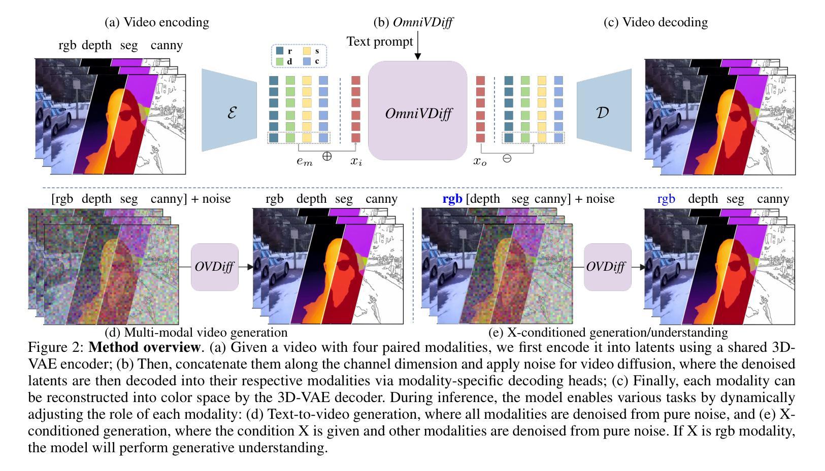 本文提出了一种新型的可控视频扩散框架OmniVDiff,旨在在一个单一的扩散模型中合成和理解多种视频视觉内容。OmniVDiff处理所有视频视觉模式来学习联合分布,采用自适应控制策略在扩散过程中动态调整各种视觉模式的作用。该框架支持文本引导的视频生成、视频理解和X条件视频生成等三个核心能力。实验表明,OmniVDiff在视频生成任务上达到了最先进的性能,并在视频理解方面取得了有竞争力的结果。其灵活性和可扩展性使其成为视频到视频翻译、视觉任务的模态适应和场景重建等下游应用的理想选择。