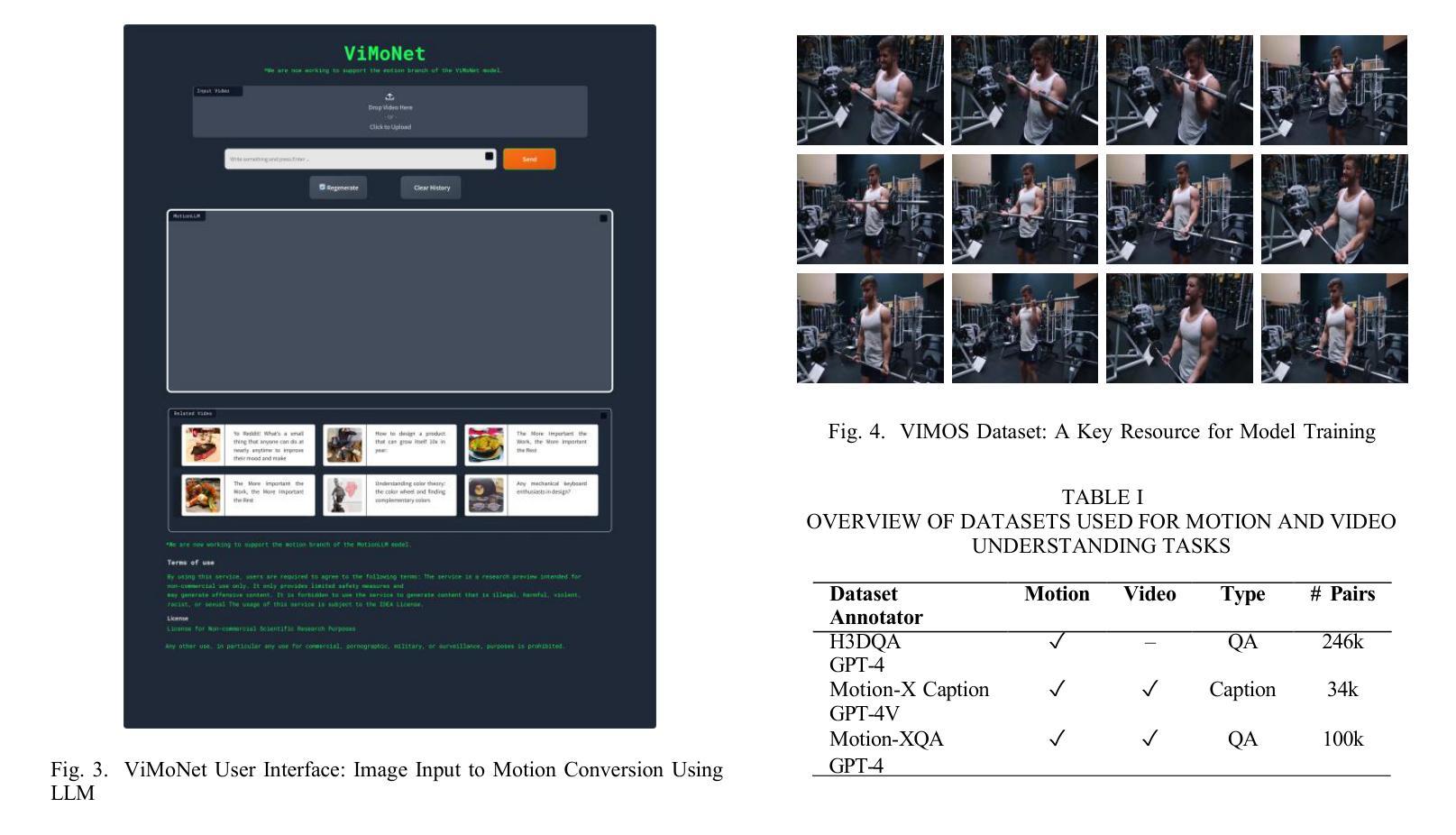 This study investigates how large language models (LLMs) can be used to understand human behavior using motion and video data. We think that mixing both types is essential to completely capture the nuanced movements and meanings of human actions, in contrast to recent models that simply concentrate on motion data or films. To address this, we provide ViMoNet, a straightforward yet effective framework for comprehending, characterizing, and deducing human action. ViMoNet employs a joint training strategy that leverages the advantages of two data types: detailed motion-text data, which is more exact, and generic video-text data, which is more comprehensive but less detailed. This aids in the model’s acquisition of rich data regarding time and space in human behavior. Additionally, we provide a brand new dataset named VIMOS that contains a variety of films, motion sequences, instructions, and subtitles. We developed ViMoNet-Bench, a standardized benchmark with carefully labeled samples, to evaluate how well models understand human behavior. Our tests show that ViMoNet outperforms existing methods in caption generation, motion understanding, and behavior interpretation.
