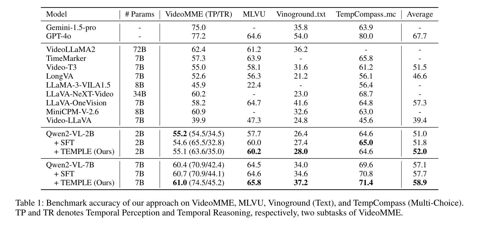 - 实验证明,TEMPLE在多个基准测试中提高了Video LLM的性能。