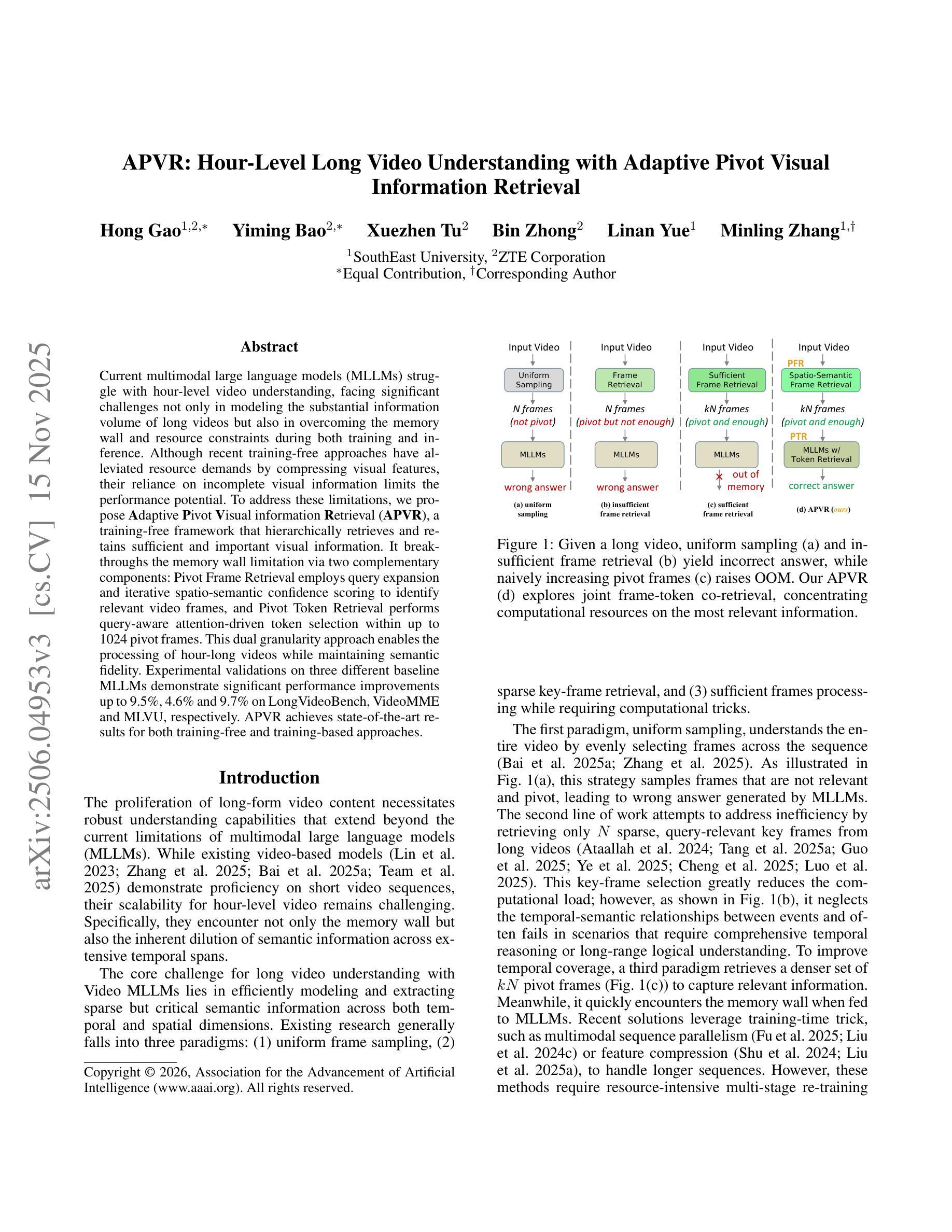 该研究针对当前多模态大型语言模型在处理长达数小时的视频时面临的挑战,提出了一种名为自适应枢轴视觉信息检索(APVR)的训练外框架。该框架能够层次地检索和保留重要且充足的视觉信息,突破内存限制。它通过两个互补组件——枢轴帧检索和枢轴令牌检索来实现这一目标。实验验证表明,该框架在三个不同的基准测试集上均实现了显著的性能提升。