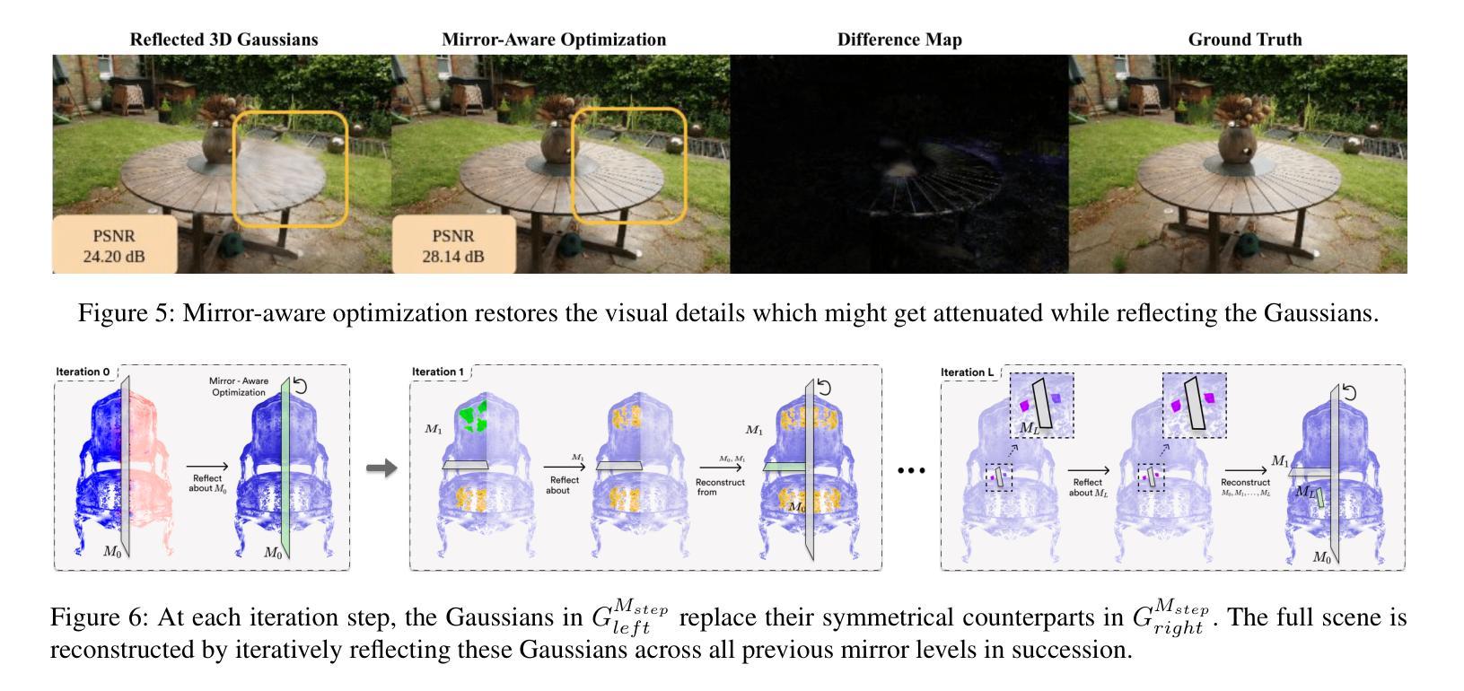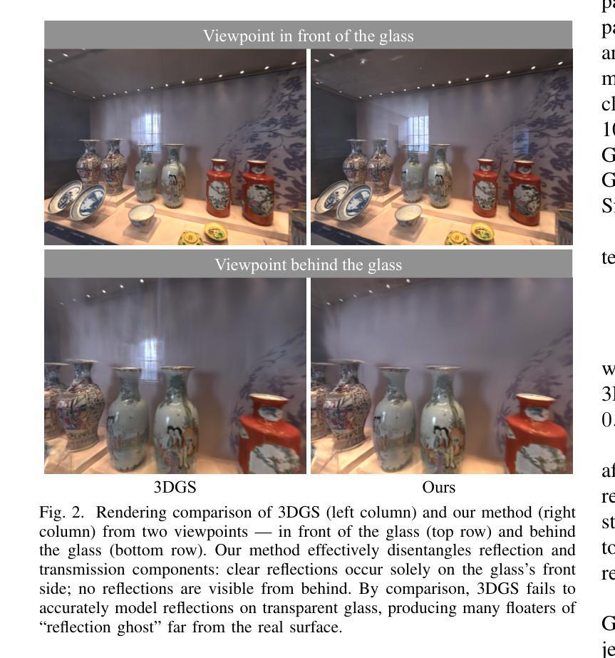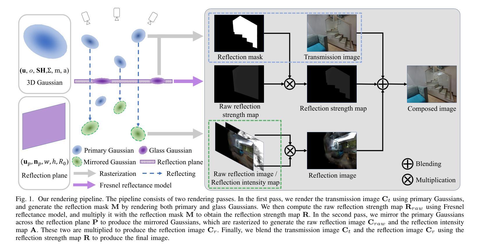 - 结合了3D高斯和可学习的反射平面,明确建模玻璃平面的视图相关反射强度。