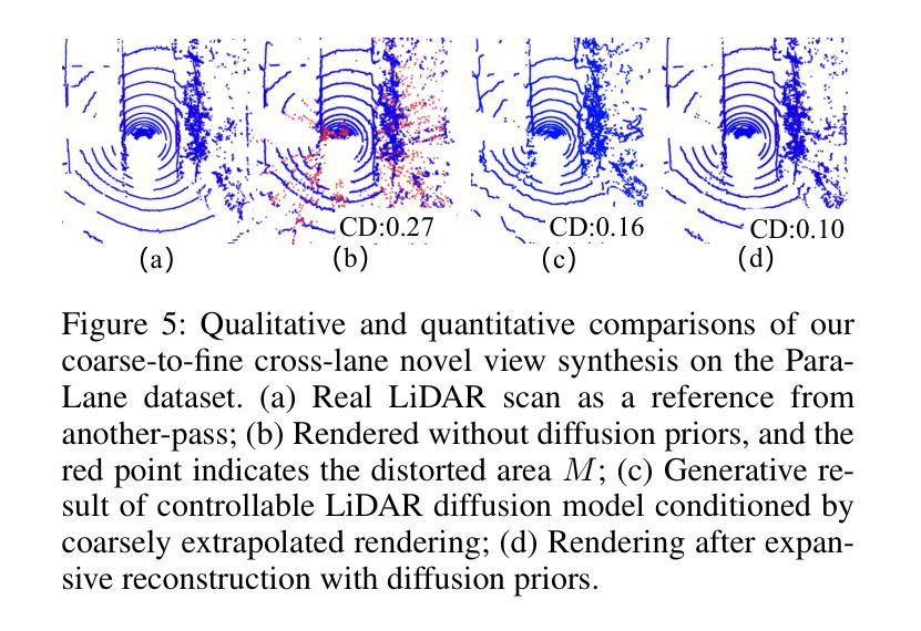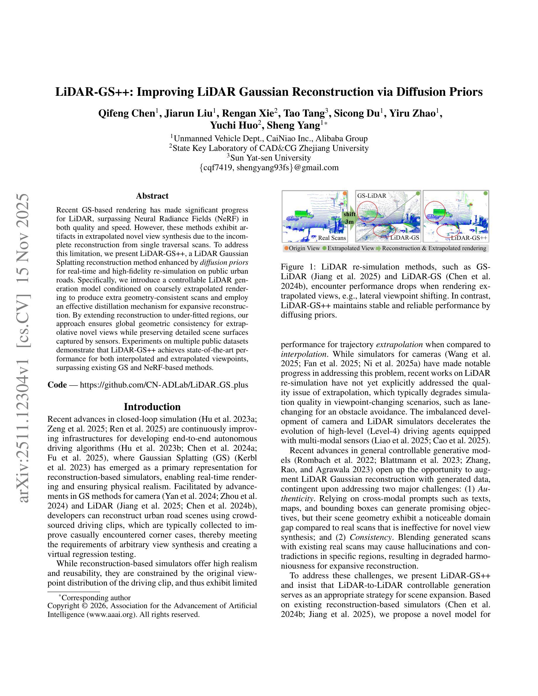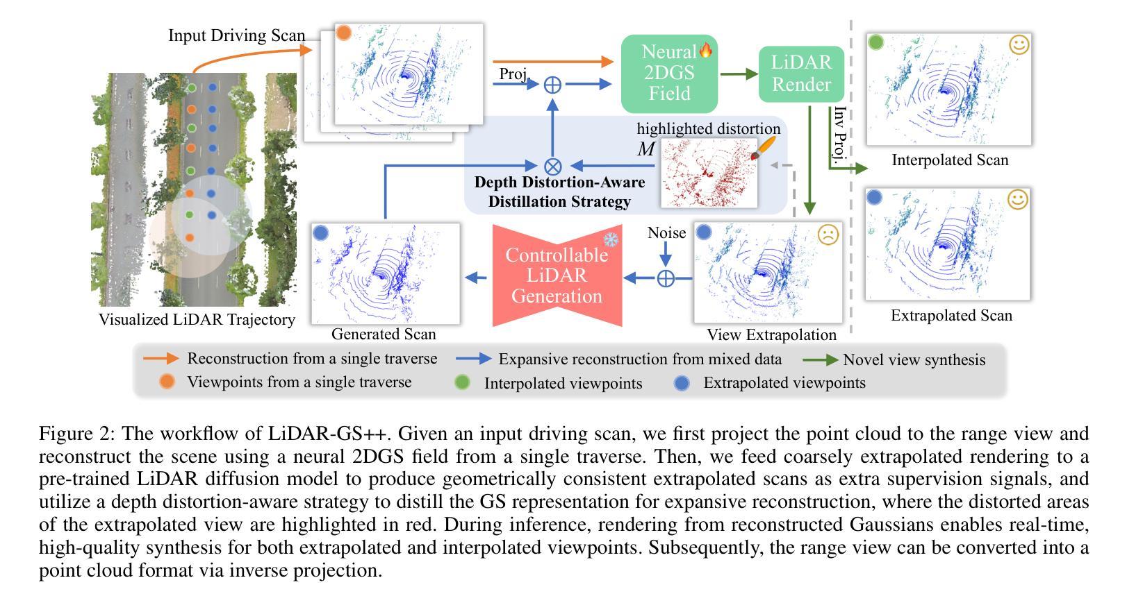 最近的基于GS的渲染在激光雷达技术上取得了显著进展,在质量和速度方面都超越了神经辐射场(NeRF)。然而,由于单次遍历扫描的重建不完整,这些方法在推断新颖视图合成时会出现伪影。为了解决这一局限性,我们提出了LiDAR-GS++,这是一种由扩散先验增强的激光雷达高斯喷涂重建方法,可用于公共城市道路进行实时高保真重新模拟。具体来说,我们引入了一个可控的激光雷达生成模型,该模型以粗略推断的渲染为条件,生成额外的几何一致性扫描,并采用了有效的蒸馏机制进行扩展重建。通过将重建扩展到未拟合区域,我们的方法确保了推断新颖视图的全局几何一致性,同时保留了传感器捕捉到的详细场景表面。在多个公共数据集上的实验表明,LiDAR-GS++在推断和推断的视点上均达到了最先进的性能,超越了现有的GS和NeRF方法。