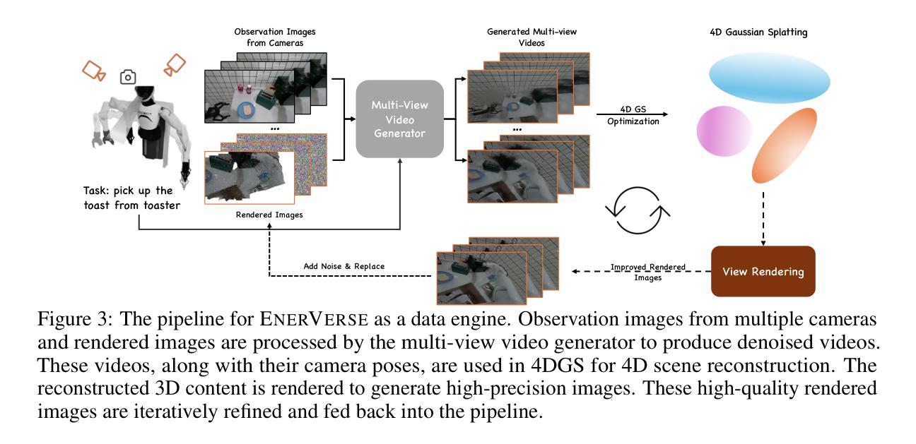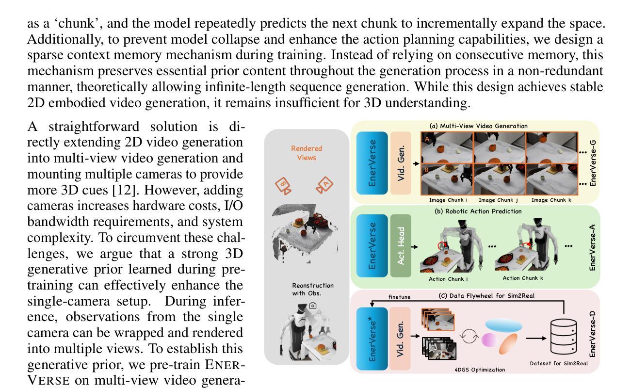 我们介绍了EnerVerse,这是一个构建和解释实体空间的生成式机器人基础模型。EnerVerse采用分块自回归视频扩散框架,根据指令预测未来的实体空间,并通过稀疏上下文记忆进行长期推理来增强预测。为了构建三维机器人世界模型,我们采用多视角视频表示,提供丰富的视角来解决运动模糊和三维定位等挑战。此外,EnerVerse-D是一个数据引擎管道,将生成建模与4D高斯涂抹相结合,形成一个自我加强的数据循环,以缩小仿真与现实的差距。利用这些创新技术,EnerVerse通过策略头(EnerVerse-A)将4D世界表示转化为物理动作,在模拟和真实世界任务中都实现了最先进的性能。为了提高效率,EnerVerse-A重用了第一次去噪步骤的特征,并预测动作块,在单个RTX 4090上实现每8步动作块约280毫秒的响应时间。更多视频演示、数据集样本可在我们的项目页面找到。
