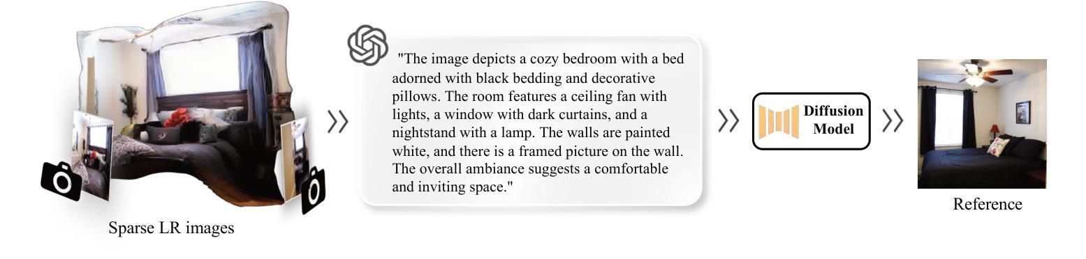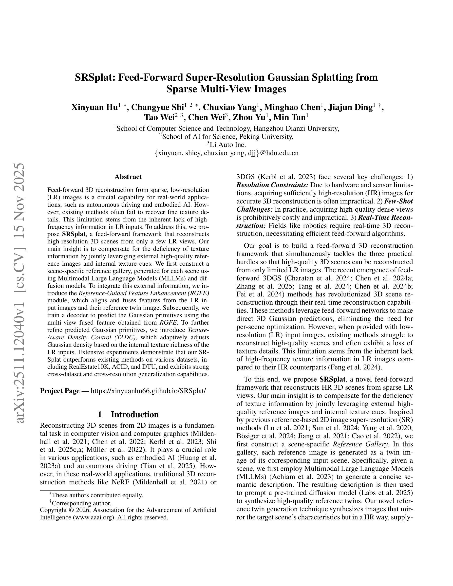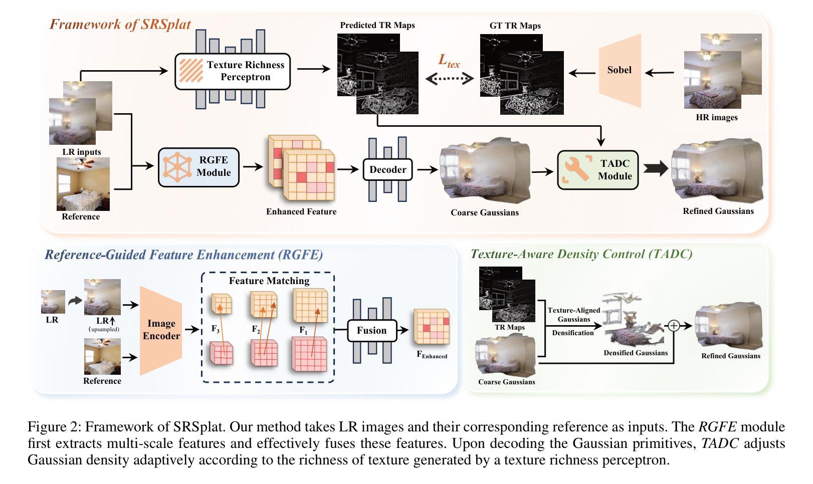 从稀疏、低分辨率(LR)图像进行前馈3D重建是自动驾驶和嵌入式AI等现实世界应用中的关键能力。然而,现有方法往往无法恢复精细的纹理细节。这种限制源于LR输入中缺乏高频信息。为了解决这一问题,我们提出了SRSplat,这是一个前馈框架,仅从几个LR视角重建高分辨率的3D场景。我们的主要见解是通过联合利用外部高质量参考图像和内部纹理线索来弥补纹理信息的不足。我们首先针对每个场景,利用多模态大型语言模型(MLLMs)和扩散模型构建场景特定参考画廊。为了整合这些外部信息,我们引入了参考引导特征增强(RGFE)模块,该模块对齐并融合来自LR输入图像和其参考孪生图像的特征。随后,我们训练一个解码器,使用从RGFE获得的多视图融合特征来预测高斯基元。为了进一步细化预测的高斯基元,我们引入了纹理感知密度控制(TADC),它可以根据LR输入的内部纹理丰富程度自适应地调整高斯密度。大量实验表明,我们的SRSplat在包括RealEstate10K、ACID和DTU等各种数据集上的性能优于现有方法,并表现出强大的跨数据集和跨分辨率泛化能力。