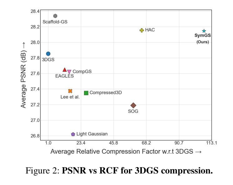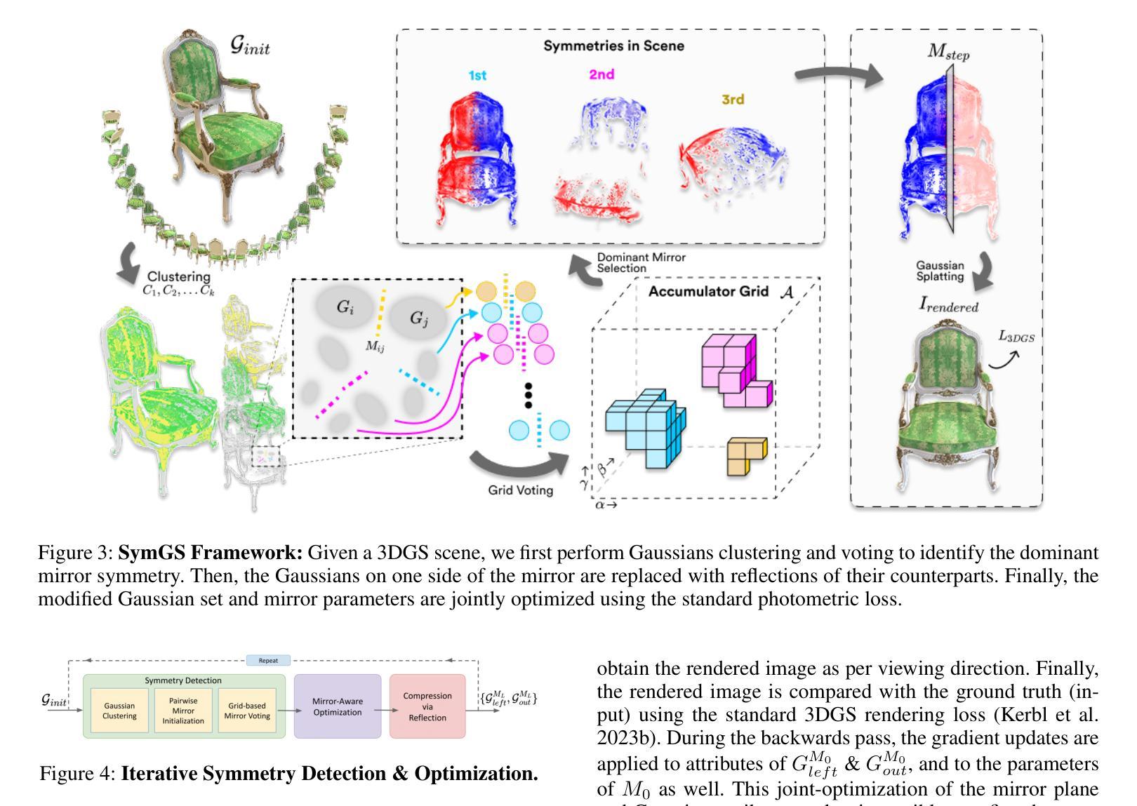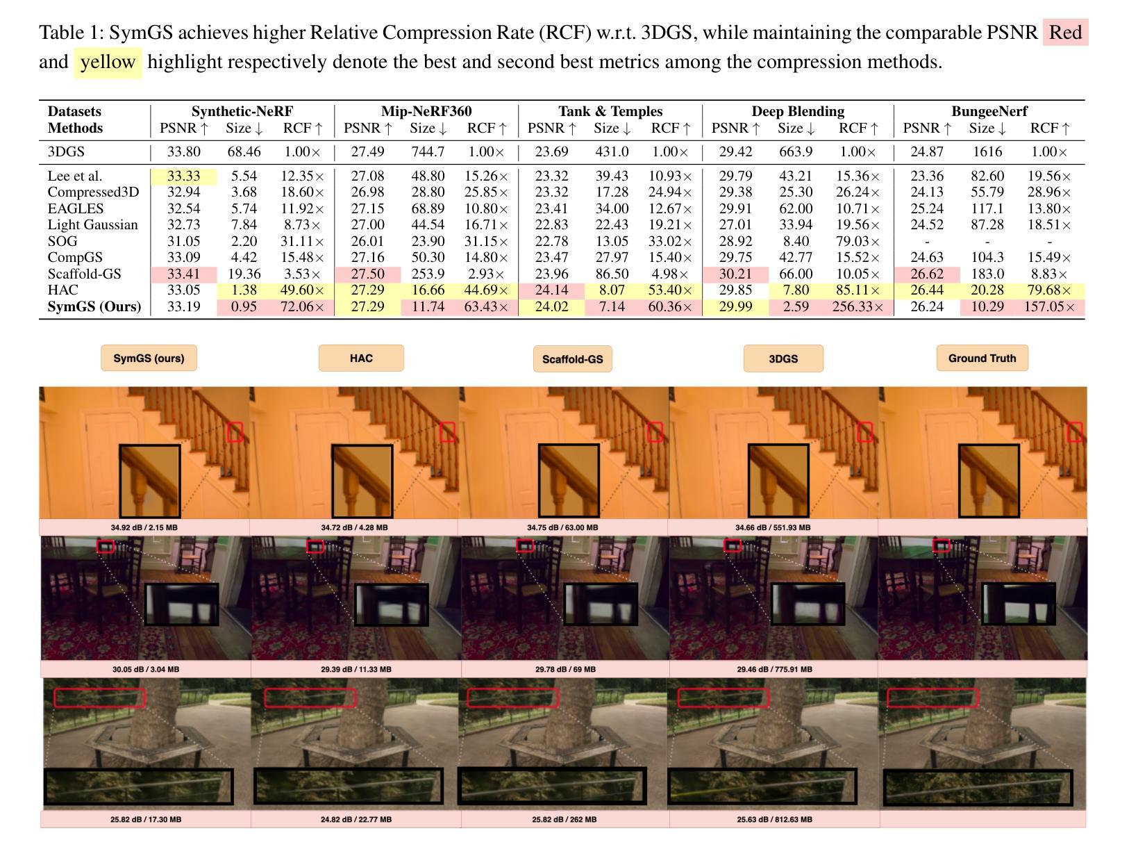 3D高斯延展技术已成为新型视角合成中的变革性技术,这主要是因为其高速渲染和逼真的保真度。然而,其内存占用随着场景的复杂性而迅速扩展,经常达到数GB。现有方法通过引入利用基于原始级别的冗余的压缩策略来解决这个问题,通过相似性检测和量化来实现。我们的目标是通过融入对称感知技术来超越此类方法的压缩极限,特别是针对镜像对称来消除冗余原始数据。我们提出了一种新型压缩框架“SymGS”,将可学习的镜像引入场景,从而消除局部和全局反射冗余以实现压缩。我们的框架可以作为最新压缩方法的即插即用增强功能(例如HAC),以实现进一步的压缩。与HAC相比,我们在基准数据集上实现了1.66倍的压缩(大规模场景上可达3倍)。平均而言,SymGS实现了对3DGS场景的108倍压缩,同时保持了渲染质量。项目页面和补充材料可在symgs.github.io找到。