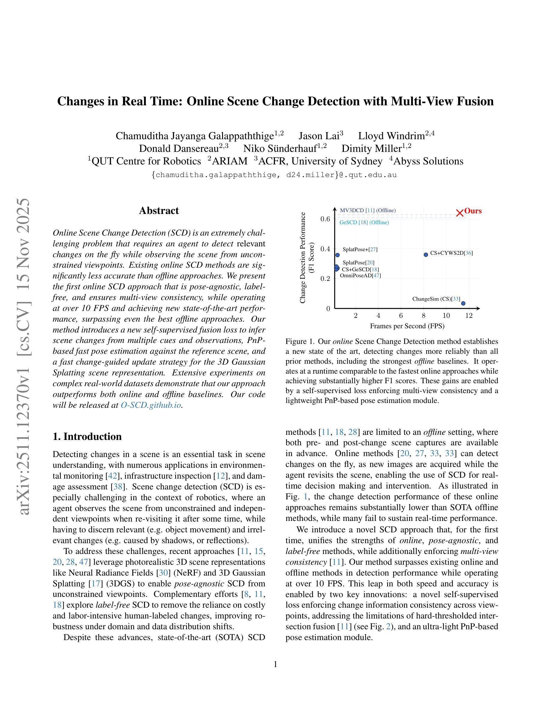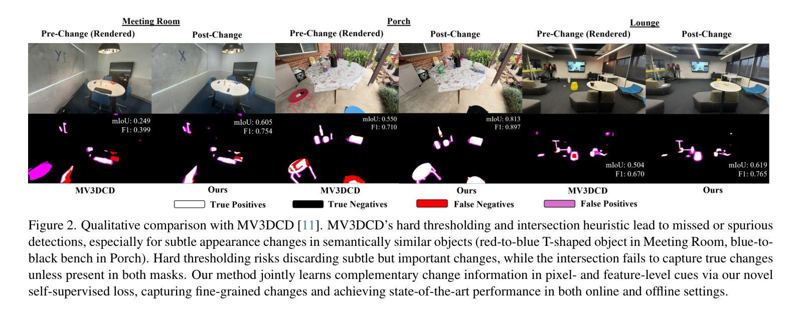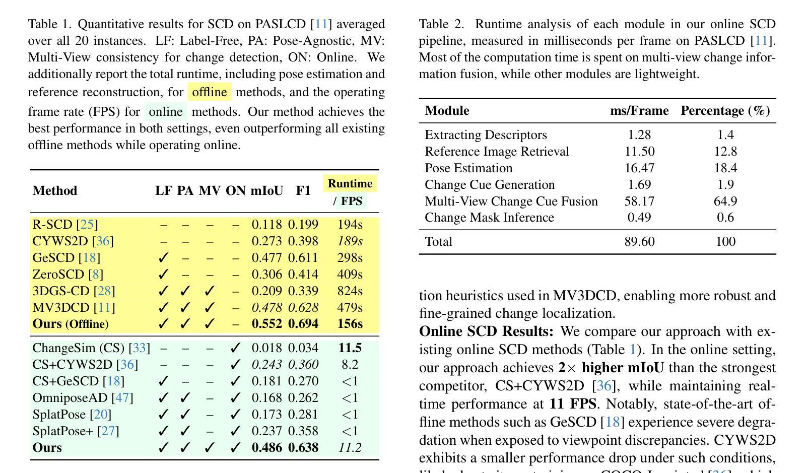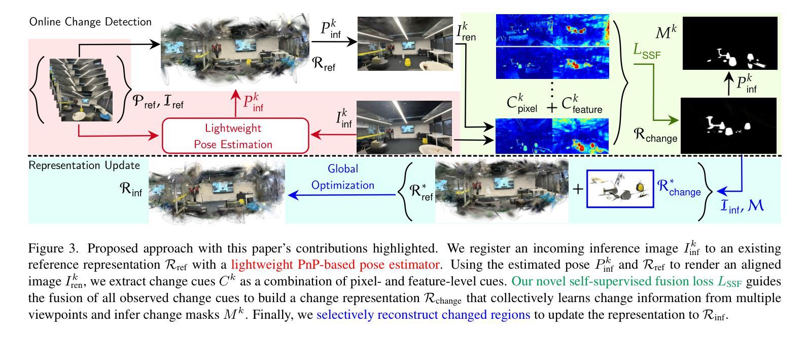 在线场景变化检测(SCD)是一个极具挑战性的问题,要求智能体在从不受约束的视角观察场景时检测相关的变化。现有的在线SCD方法在准确性上远远落后于离线方法。本文提出了首个在线SCD方法,该方法具有姿态无关性、无需标签,并确保了多视角一致性,同时以超过10 FPS的速度运行,实现了超越现有离线方法的最新性能。通过引入新的自监督融合损失来从多个线索和观察中推断场景变化,采用基于PnP的快速姿态估计以匹配参考场景,以及针对快速场景变化的指导更新策略进行快速重建场景的更新,方法显示出极大的优势。大量实验证明该方法优于在线和离线基准测试。