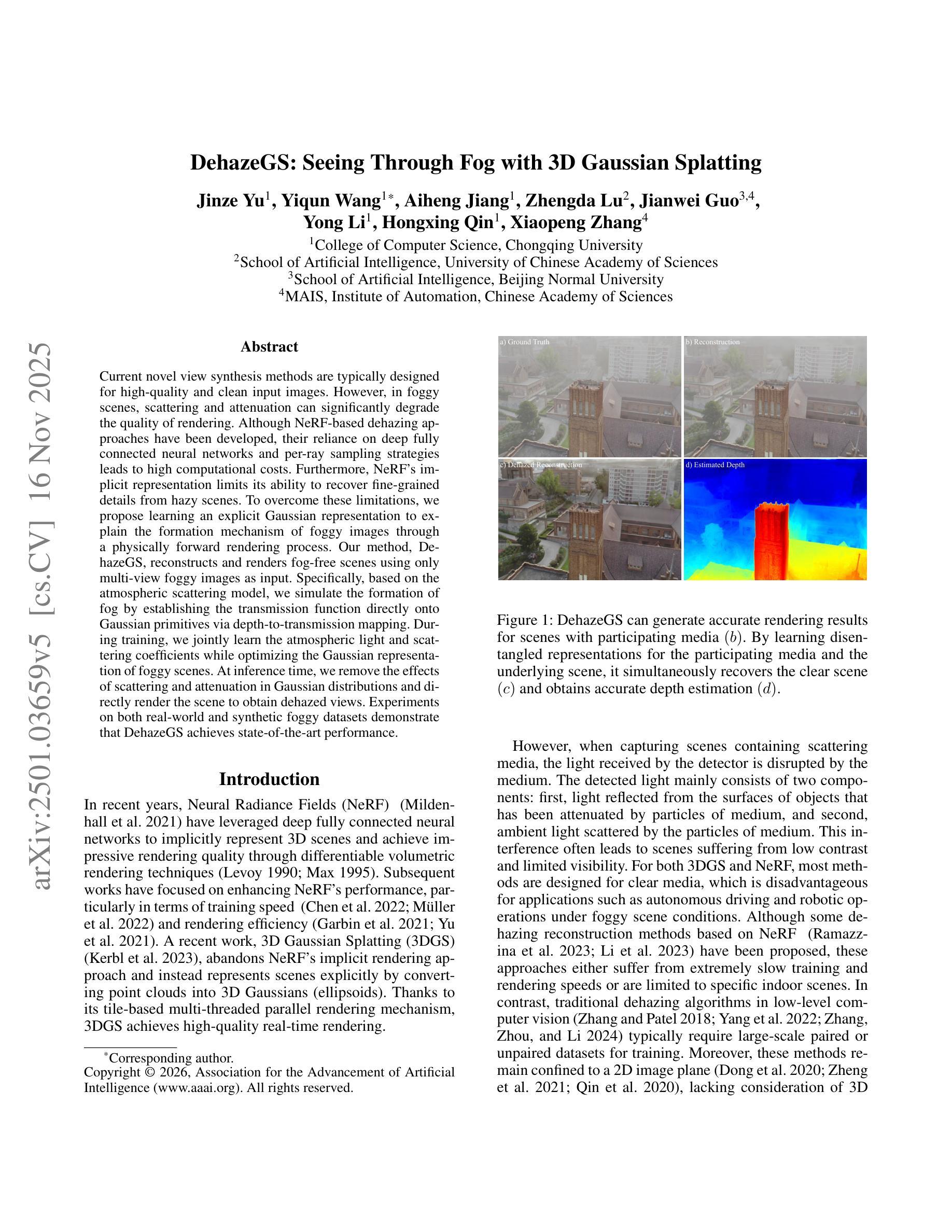 Current novel view synthesis methods are typically designed for high-quality and clean input images. However, in foggy scenes, scattering and attenuation can significantly degrade the quality of rendering. Although NeRF-based dehazing approaches have been developed, their reliance on deep fully connected neural networks and per-ray sampling strategies leads to high computational costs. Furthermore, NeRF’s implicit representation limits its ability to recover fine-grained details from hazy scenes. To overcome these limitations, we propose learning an explicit Gaussian representation to explain the formation mechanism of foggy images through a physically forward rendering process. Our method, DehazeGS, reconstructs and renders fog-free scenes using only multi-view foggy images as input. Specifically, based on the atmospheric scattering model, we simulate the formation of fog by establishing the transmission function directly onto Gaussian primitives via depth-to-transmission mapping. During training, we jointly learn the atmospheric light and scattering coefficients while optimizing the Gaussian representation of foggy scenes. At inference time, we remove the effects of scattering and attenuation in Gaussian distributions and directly render the scene to obtain dehazed views. Experiments on both real-world and synthetic foggy datasets demonstrate that DehazeGS achieves state-of-the-art performance. visualizations are available at https://dehazegs.github.io/