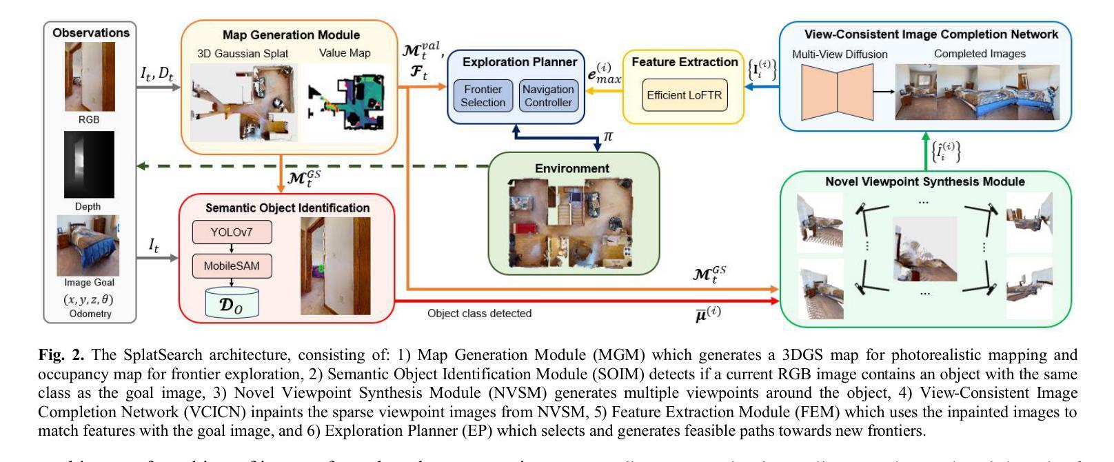 - SplatSearch通过渲染目标对象的多视角图像,并利用多视角扩散模型完成图像缺失区域的填充,实现与目标图像的稳定特征匹配。