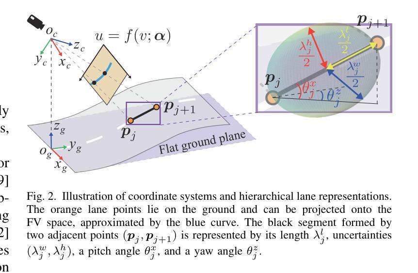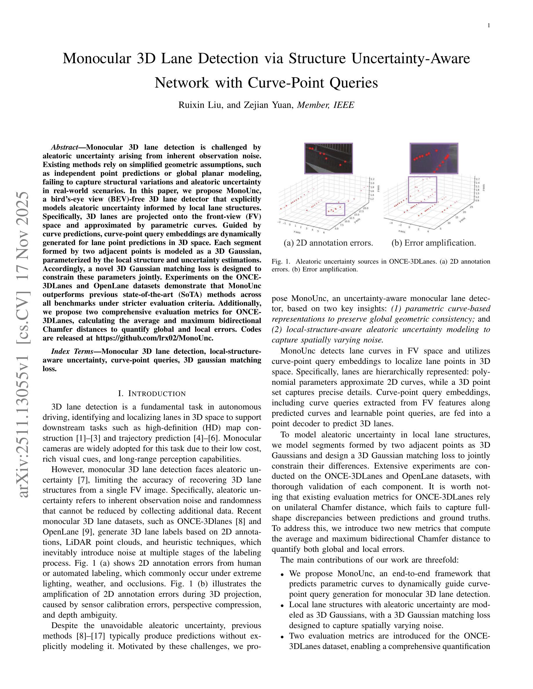 本文提出一种名为MonoUnc的鸟瞰图(BEV)自由3D车道检测器,它显式建模由局部车道结构信息引起的偶然不确定性。通过投影3D车道到前视(FV)空间并使用参数曲线近似表示,动态生成曲线点查询嵌入以进行3D空间中的车道点预测。每个由相邻两点形成的线段被建模为3D高斯分布,由局部结构和不确定性估计参数化。在ONCE-3DLanes和OpenLane数据集上的实验表明,MonoUnc在更严格的评估标准下全面超越现有先进方法。