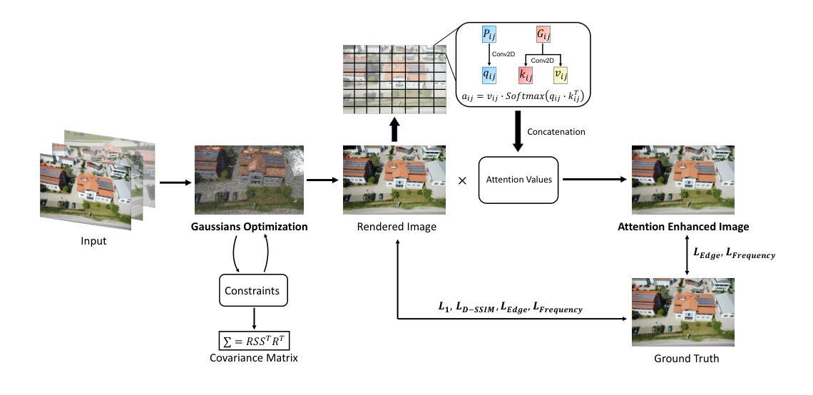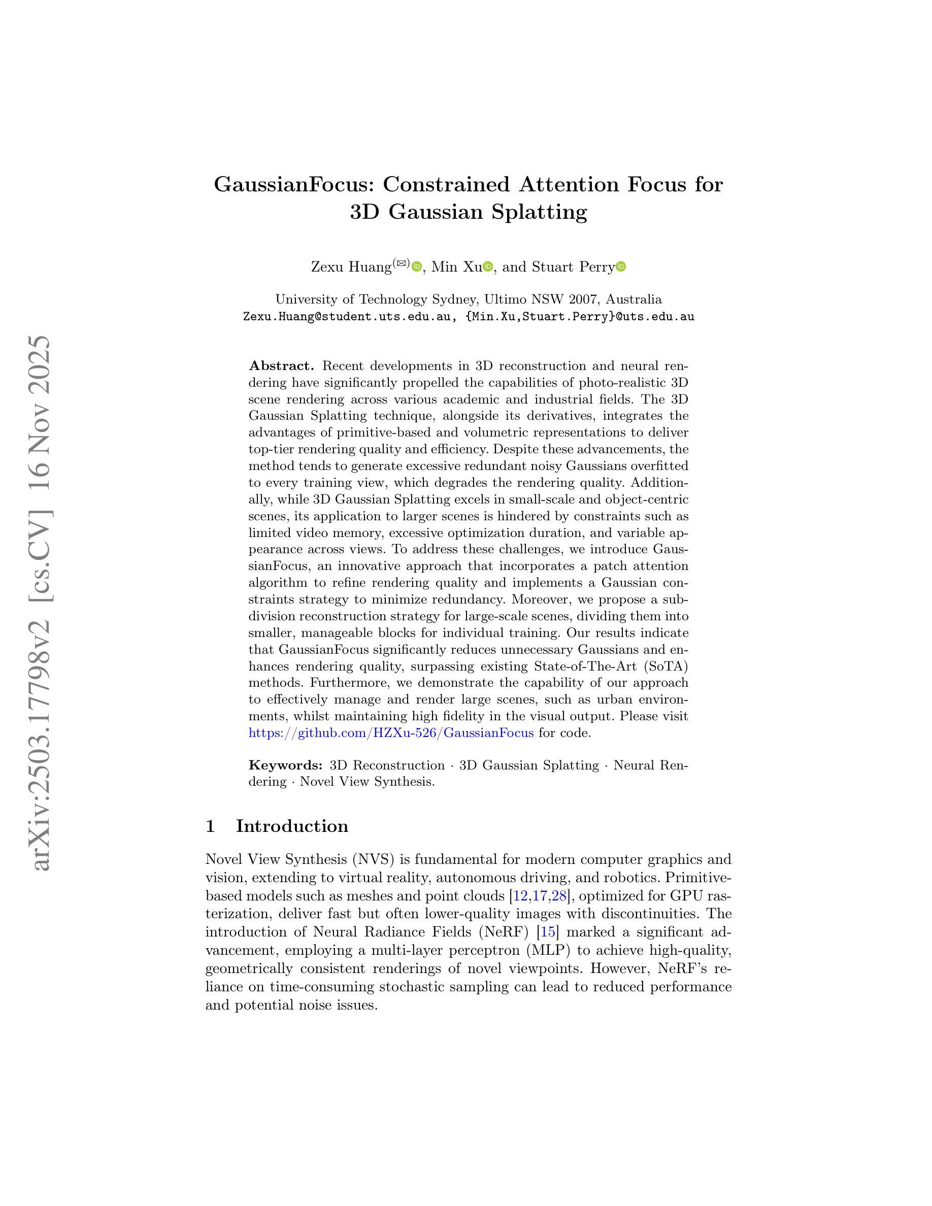 近期三维重建和神经渲染的发展极大地推动了多尺度全景技术在各学术和产业领域中的逼真三维场景渲染能力。三维高斯展开技术及其衍生技术结合了基于原始数据和体积表示的优势,实现了高质量的渲染效果和效率。然而,该技术往往会产生大量冗余的噪声高斯分布,过度拟合每个训练视图,导致渲染质量下降。此外,虽然三维高斯展开在小规模以对象为中心的场景中表现出色,但其应用于大型场景时受到视频内存限制、优化时间过长以及不同视图之间外观变化等约束的阻碍。为了应对这些挑战,我们引入了GaussianFocus这一创新方法,它结合了补丁注意力算法来优化渲染质量,并实施了高斯约束策略来减少冗余。此外,我们提出了一种用于大规模场景的细分重建策略,将它们划分为较小的、可管理的块进行单独训练。我们的结果表明,GaussianFocus显著减少了不必要的高斯分布,提高了渲染质量,超越了现有的最先进方法。此外,我们展示了我们的方法在管理和渲染大型场景(如城市环境)方面的能力,同时保持视觉输出的高保真度。
