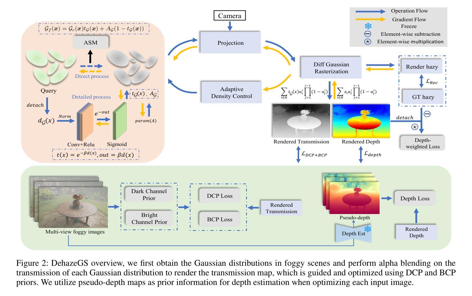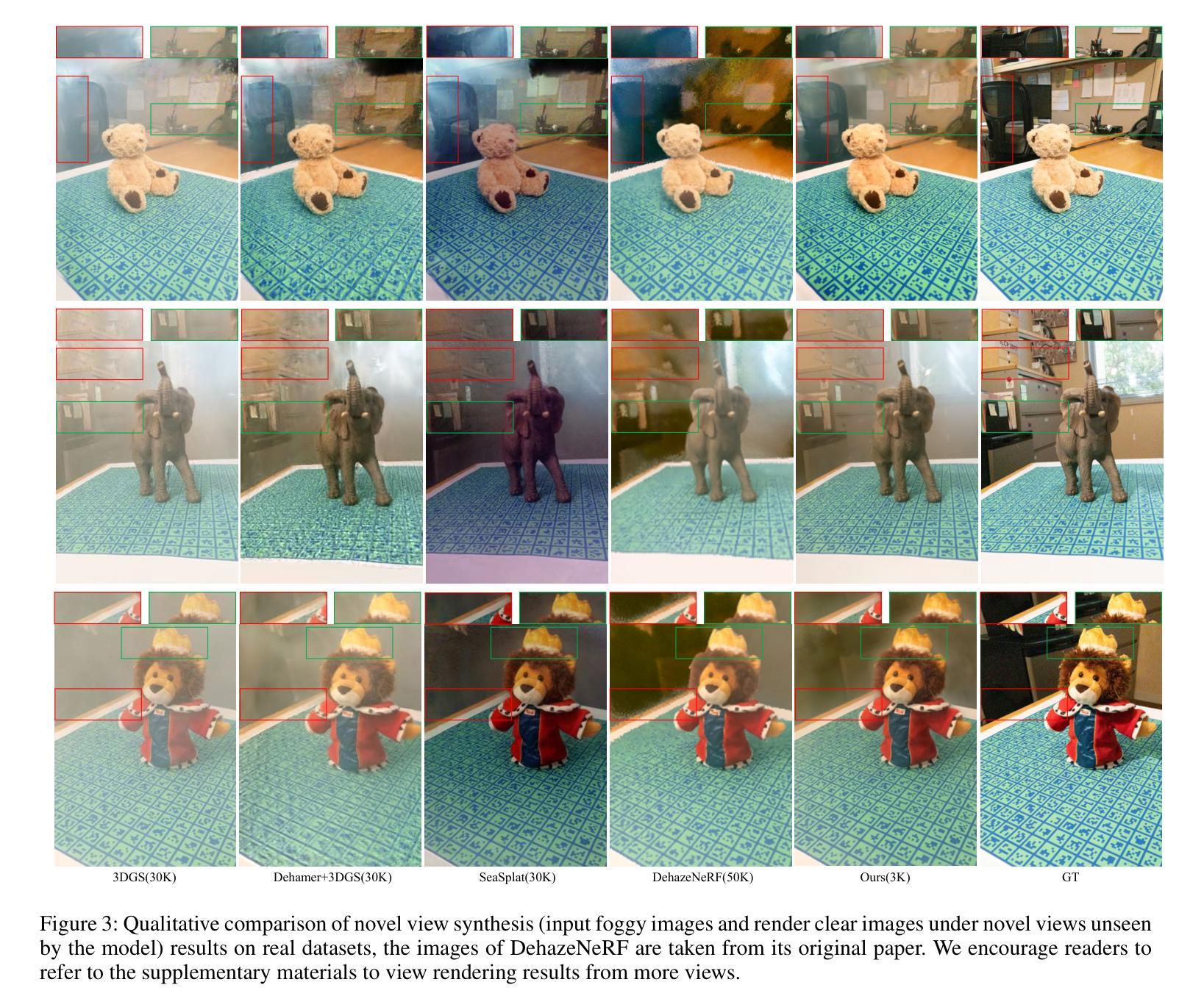 当前的新型视图合成方法通常针对高质量和清晰的输入图像进行设计。然而,在雾天场景中,散射和衰减会显著降低渲染质量。尽管已经开发了基于NeRF的去雾方法,但它们依赖于深度全连接神经网络和按射线采样策略,导致计算成本高昂。此外,NeRF的隐式表示限制了其从雾天场景中恢复细节的能力。为了克服这些局限性,我们提出了学习显式高斯表示,通过物理前向渲染过程来解释雾天图像的形成机制。我们的方法DehazeGS仅使用多视角雾天图像作为输入,重建和渲染无雾场景。具体来说,基于大气散射模型,我们通过深度到传输映射直接在高斯原始数据上建立传输函数来模拟雾的形成。在训练过程中,我们联合学习大气光和散射系数,同时优化雾天场景的高斯表示。在推理阶段,我们消除了高斯分布中的散射和衰减影响,直接渲染场景以获得去雾的视图。在现实世界和合成雾数据集上的实验表明,DehazeGS达到了最新技术水平。可视化请访问:[https://dehazegs.github.io/] 。