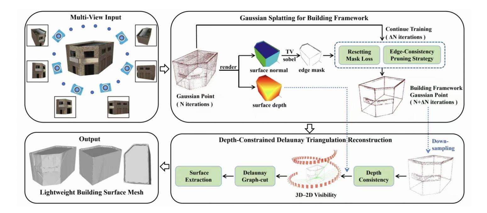 该文介绍了一种名为SF-Recon的方法,该方法可从多视角图像直接重建轻量级建筑表面模型,无需后续网格简化。通过初始的3D高斯喷溅(3DGS)场获得视角一致表示,随后通过正常梯度引导的高斯优化和基于多视角边缘一致性的修剪来增强结构锐度和抑制非结构伪影,最后通过多视角深度约束Delaunay三角剖分将结构化高斯场转换为轻量级、结构真实的建筑网格。