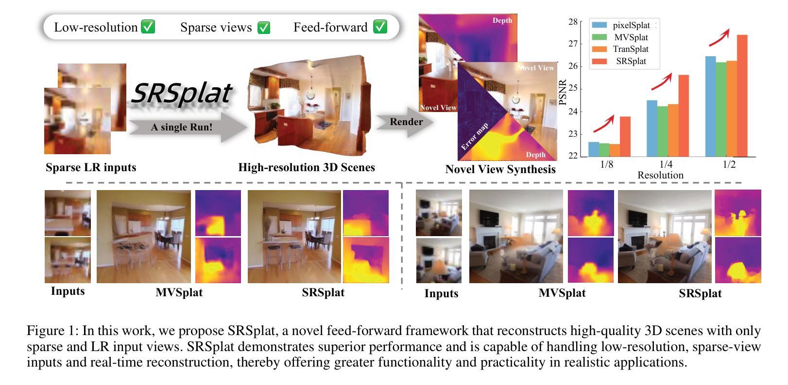 - SRSplat是一个能够从少量低分辨率图像重建高分辨率3D场景的反馈前框架。