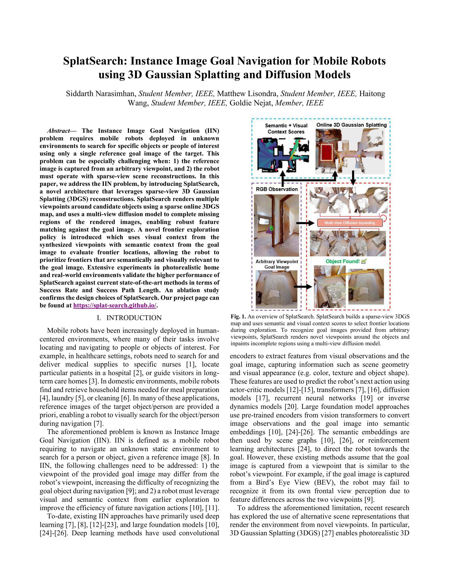 实例图像目标导航(IIN)问题要求部署在未知环境中的移动机器人仅使用单个目标参考图像来搜索特定对象或感兴趣的人。当面临以下情况时,这个问题可能尤其具有挑战性:1)参考图像是从任意视角捕获的;2)机器人必须在稀疏视图场景重建中进行操作。在本文中,我们通过引入SplatSearch来解决IIN问题,这是一种新型架构,它利用稀疏视图三维高斯摊铺重建技术(Sparse-view 3D Gaussian Splatting, 简称3DGS)。SplatSearch使用稀疏在线3DGS地图渲染候选对象周围的多视角图像,并使用多视角扩散模型来补充渲染图像的缺失区域,从而实现与目标图像之间的稳健特征匹配。我们引入了一种新型前沿探索策略,该策略使用合成视角的视觉上下文和目标图像中的语义上下文来评估前沿位置,从而使机器人能够优先探索在语义和视觉上与目标图像相关的前沿。在逼真的家庭和真实世界环境中的大量实验验证了SplatSearch相对于当前最先进的方法具有更高的成功率和成功路径长度方面的性能。消融研究证实了SplatSearch的设计选择。
