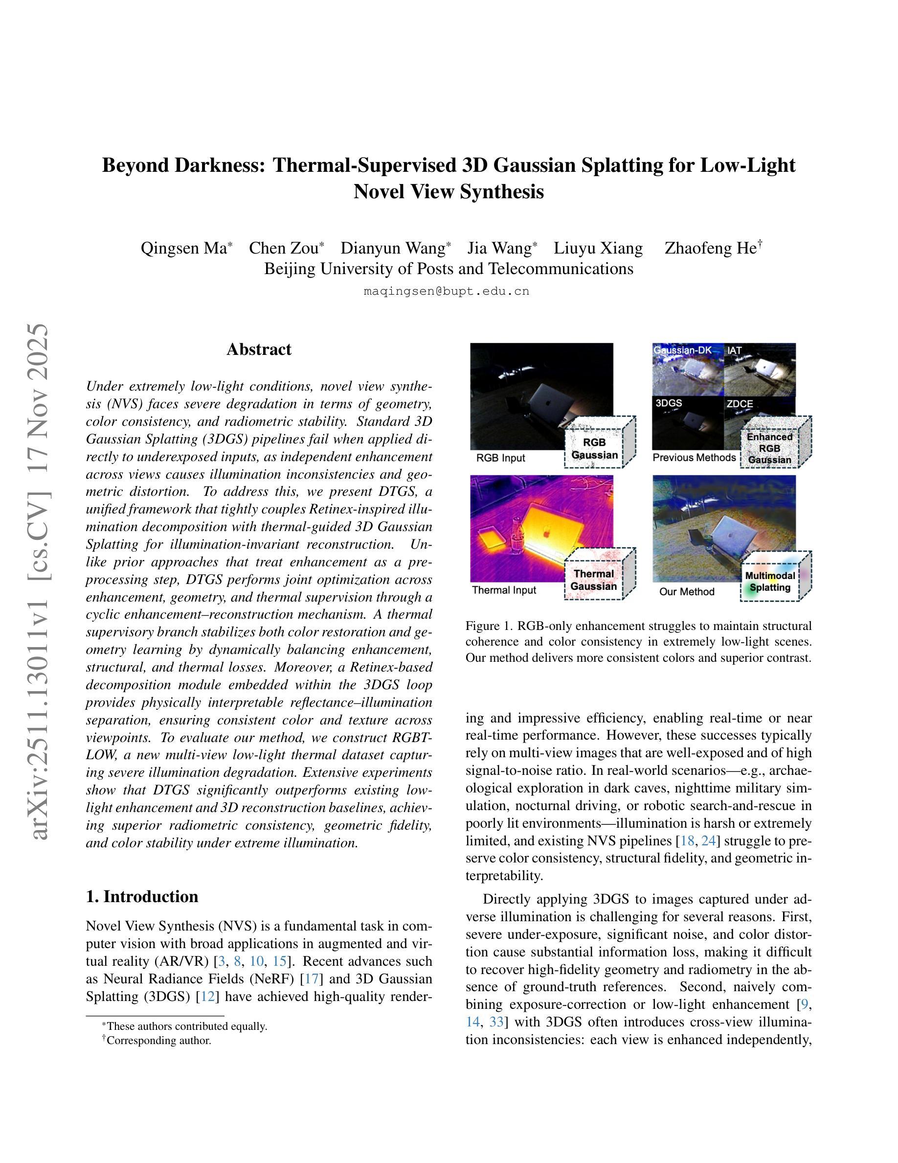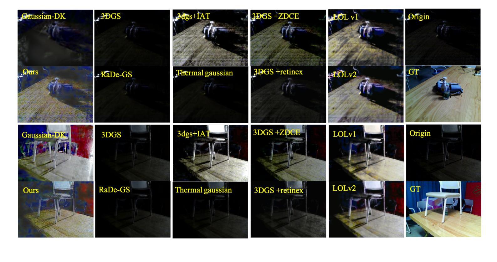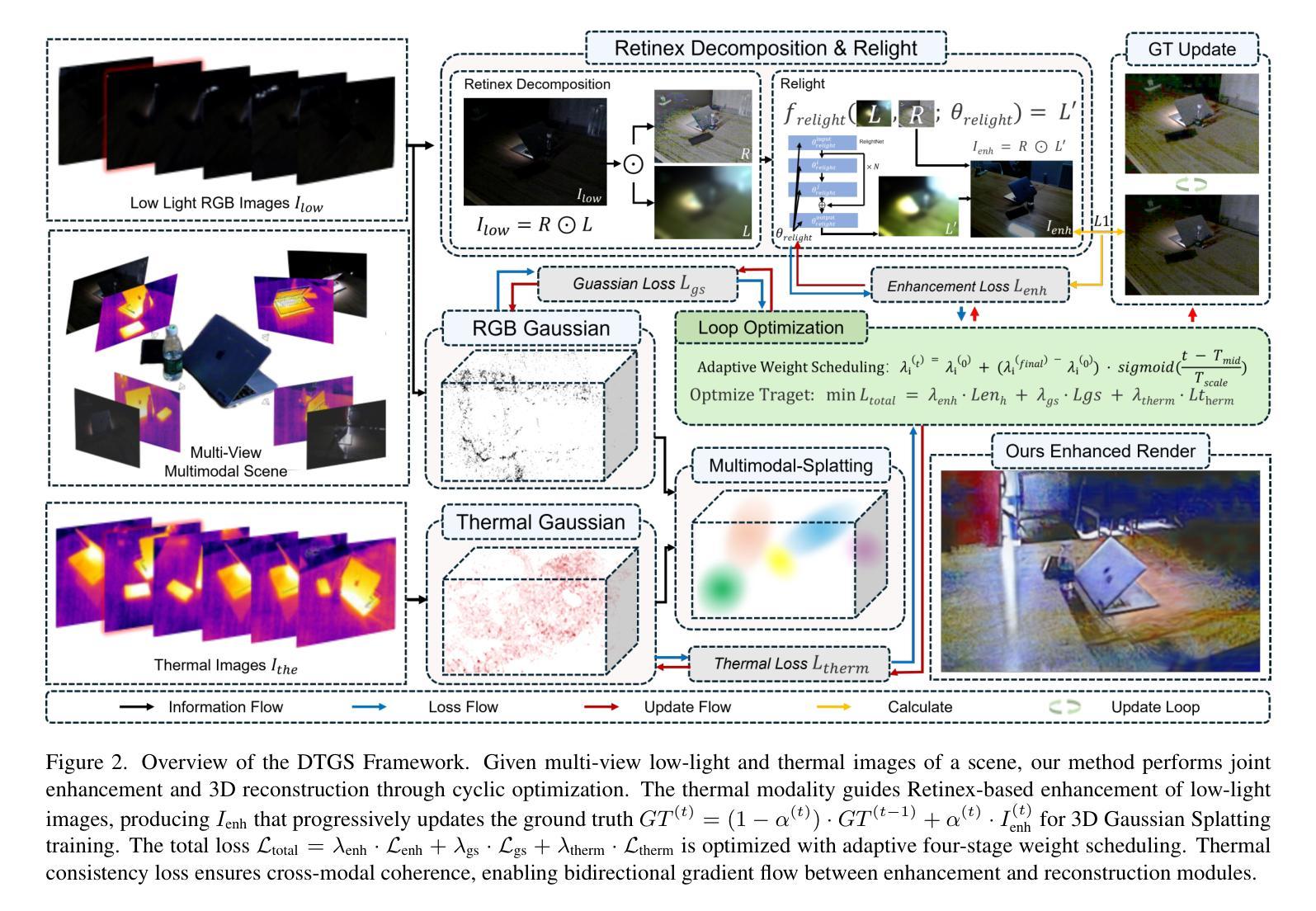 在极低光条件下,新型视图合成(NVS)在几何、色彩一致性和辐射稳定性方面面临严重退化。当直接应用于曝光不足的输入时,标准的三维高斯喷绘(3DGS)流水线会失效,因为独立的视图增强会导致照明不一致和几何失真。为了解决这个问题,我们提出了DTGS,这是一个统一框架,它通过Retinex启发式的照明分解与热引导的三维高斯喷绘紧密耦合,实现照明不变重建。不同于将增强作为预处理步骤的先前方法,DTGS通过循环增强-重建机制,在增强、几何和热监督之间进行联合优化。热监督分支通过动态平衡增强、结构和热损失,稳定颜色恢复和几何学习。此外,嵌入在3DGS循环内的基于Retinex的分解模块提供物理可解释的反射-照明分离,确保跨视点的颜色和纹理一致性。为了评估我们的方法,我们构建了RGBT-LOW,这是一个新的多视角低光热数据集,捕捉严重的照明退化。大量实验表明,DTGS在极端照明条件下显著优于现有的低光增强和3D重建基线,实现了卓越的辐射一致性、几何保真度和颜色稳定性。