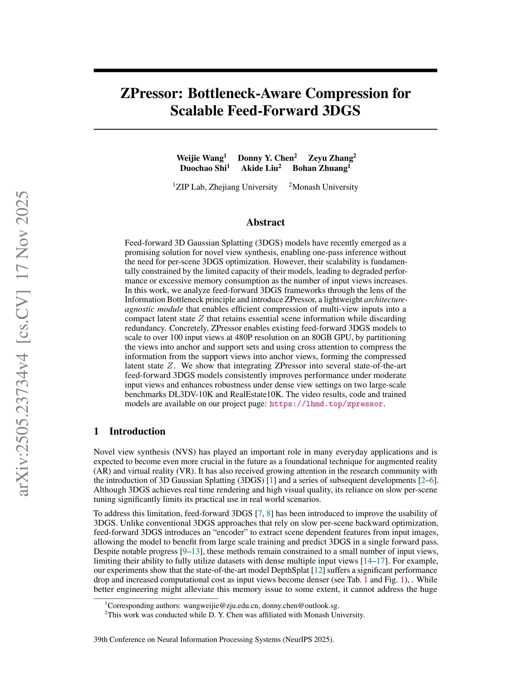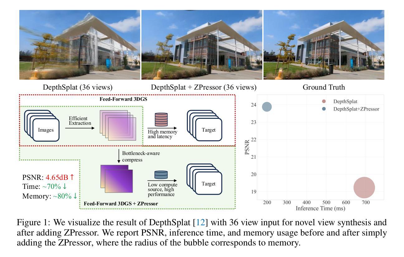 前馈三维高斯摊铺(3DGS)模型最近作为合成新视角的一种有前途的解决方案而出现,无需对每个场景进行单独的优化就可以进行一次推理推断。然而,模型的有限容量从根本上限制了其可扩展性,随着输入视图数量的增加,可能导致性能下降或内存消耗过大。在这项工作中,我们通过信息瓶颈原理来分析前馈3DGS框架,并引入了ZPressor,这是一个轻量级的架构无关模块,能够将多视图输入有效地压缩成紧凑的潜在状态Z,同时保留关键场景信息并丢弃冗余信息。具体来说,ZPressor通过将视图划分为锚点集和支持集并使用交叉注意力将支持视图的信息压缩到锚视图中来形成压缩的潜在状态Z,从而实现了在容量为80GB的GPU上支持高达一百个输入视图在480P分辨率下的扩展能力。我们展示了将ZPressor集成到几种先进的前馈3DGS模型中,在大型基准测试DL3DV-10K和RealEstate10K上的一致性能改进以及在中等输入视图下的稳健性增强。视频结果、代码和训练模型均可在我们的项目页面查看:[网址链接]。
