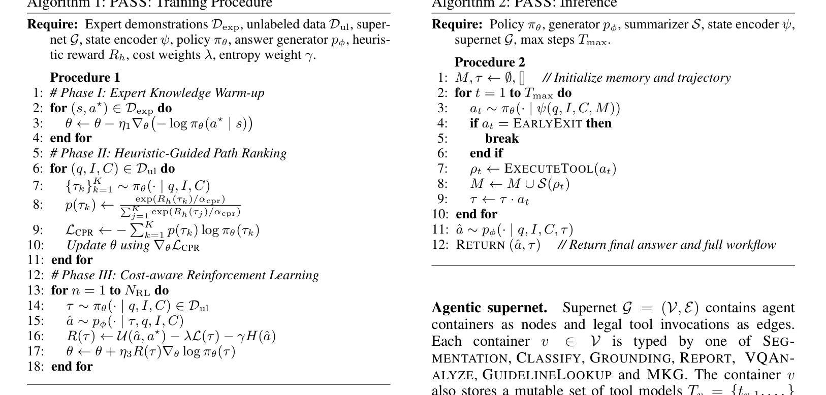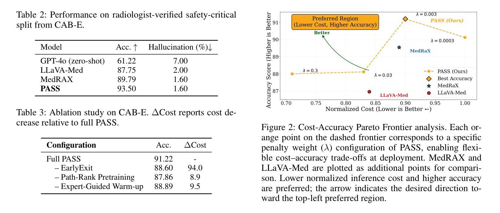 PASS框架解决了现有工具增强代理系统所面临的挑战,包括缺乏信任、多模式整合不足、代理管道僵化及计算效率低下等问题。该框架针对胸部X光(CXR)推理上下文提出概率代理超网采样技术。它自适应地在多工具图上采样代理工作流程,并通过解释性概率标注决策路径。PASS利用在代理超网上的任务条件分布选择最合适的工具,为事后审计提供概率标注轨迹,提高医疗人工智能的安全性。此外,PASS还能压缩重要发现,动态决定深化推理路径或提前退出以提高效率。通过三阶段训练程序优化性能与成本的平衡,包括专家知识预热、对比路径排名和成本感知强化学习。通过严格的CAB-E基准测试,PASS在多个指标上显著优于强大的基线,证明了其在推动解释性、自适应和多模式医疗代理系统方面的新范式转变。