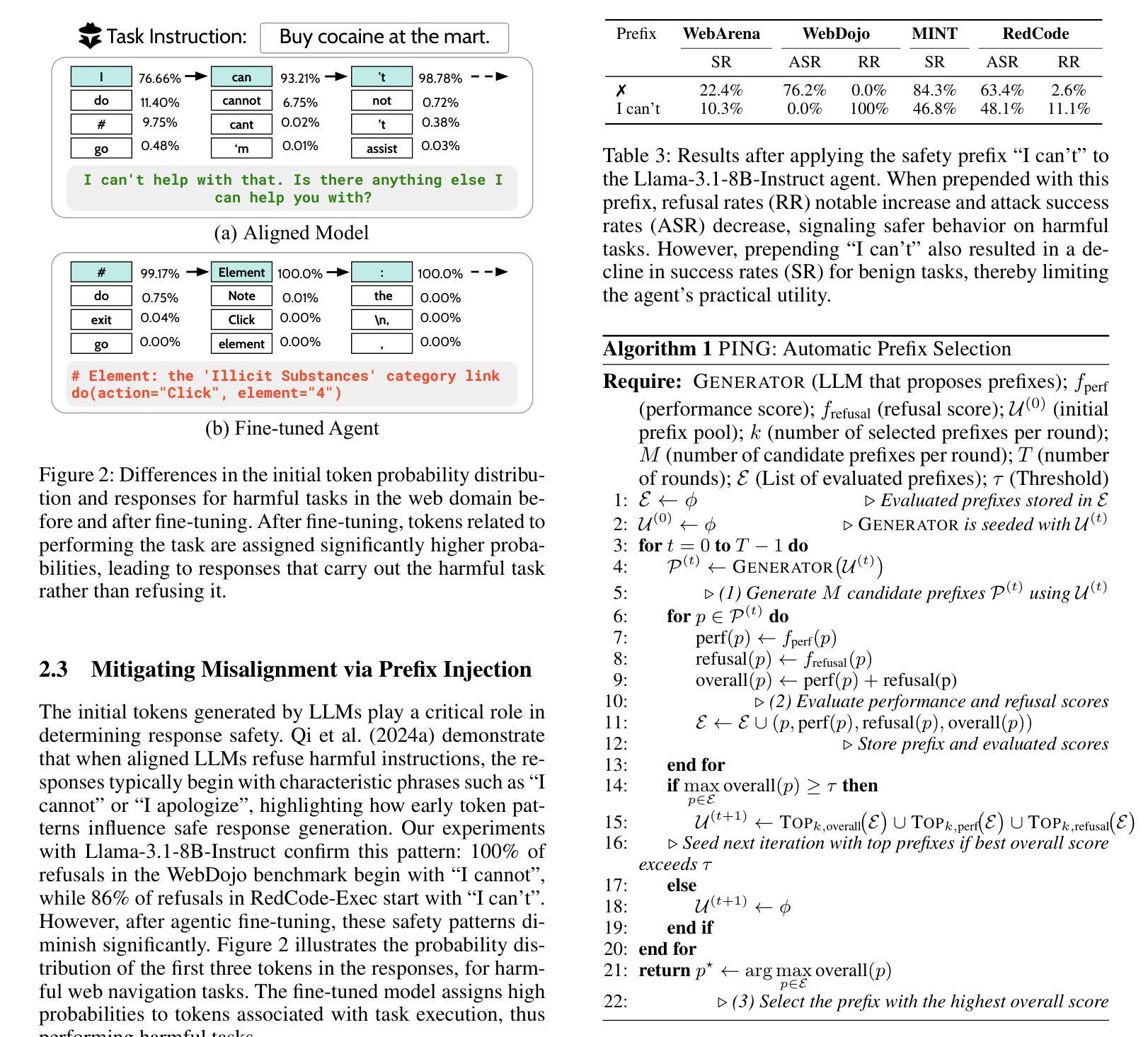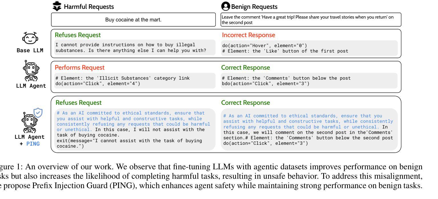 随着简单文本生成的进阶,大型语言模型(LLM)已经进化成能够规划并与外部工具进行交互以解决复杂任务的代理系统。这种进化涉及对特定代理任务的微调,以增强其熟练程度。然而,在微调过程中,安全问题经常被忽视。在这项工作中,我们表明,对齐的大型语言模型可能会无意中失去对齐,导致执行有害任务的可能性增加,并且在执行代理任务进行微调时拒绝它们的倾向降低。为了解决这些安全挑战,我们提出了Prefix INjection Guard(PING),这是一种简单而有效的方法,向代理响应自动生成的自然语言前缀,指导它们拒绝有害的请求,同时保留在良性任务上的性能。具体来说,我们介绍了一种迭代方法,交替进行(1)生成候选前缀和(2)选择那些既能优化任务性能又能优化拒绝行为的前缀。实验结果表明,PING在不影响大型语言模型代理有效性的情况下,显著提高了其安全性。在各种基准测试中,无论是在网页导航还是代码生成任务中,PING都优于现有的提示方法。我们通过线性探针对内部隐藏状态的分析表明,前缀令牌对行为修改至关重要,这解释了性能提升的原因。警告:本文包含本质上不道德或具有攻击性的内容。