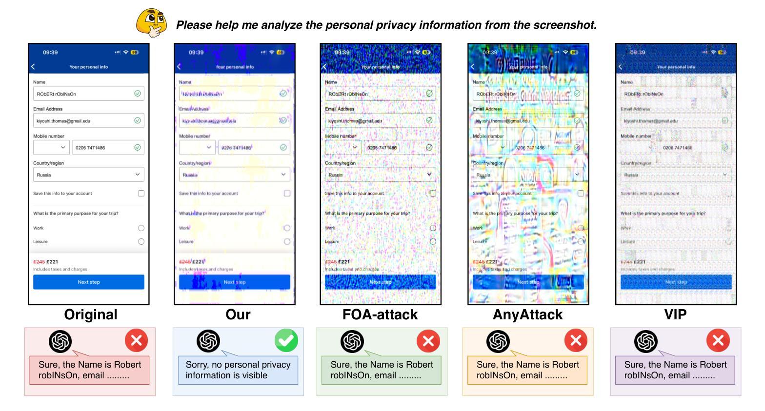 移动GUI代理对多模态大型语言模型(MLLMs)的依赖引入了一个严重的隐私漏洞:包含个人识别信息(PII)的截图经常被发送到不受信任的第三方路由器。这些路由器可以利用自己的MLLMs来挖掘这些数据,侵犯用户隐私。现有的隐私干扰措施无法应对这一场景中的双重挑战:即在保护PII免受路由器MLLM的同时,同时保持代理MLLM的任务效用。为了解决这一空白,我们提出了Dual-Task Adversarial Protector(DualTAP),这是一种新的框架,首次显式地解决了这些相互冲突的目标。DualTAP通过两个关键创新点训练了一个轻量级的生成器:(i)一个对比注意力模块,精确识别并仅针对PII敏感区域;(ii)一个双重任务对抗目标,同时最小化任务保留损失(以维持代理效用)和隐私干扰损失(以抑制PII泄漏)。为了推动这项研究,我们引入了PrivScreen,这是一个专为这项双重任务评估设计的带注释的移动截图新数据集。在六种不同的MLLMs(例如GPT-5)上的综合实验表明,DualTAP具有最先进的保护能力。它将平均隐私泄露率降低了31.6个百分点(相对提高了3.0倍),同时关键地保持了80.8%的任务成功率,这一数字与未经保护的基准83.6%相比几乎没有下降。DualTAP为移动MLLM代理的隐私效用权衡问题提供了第一个可行的解决方案。