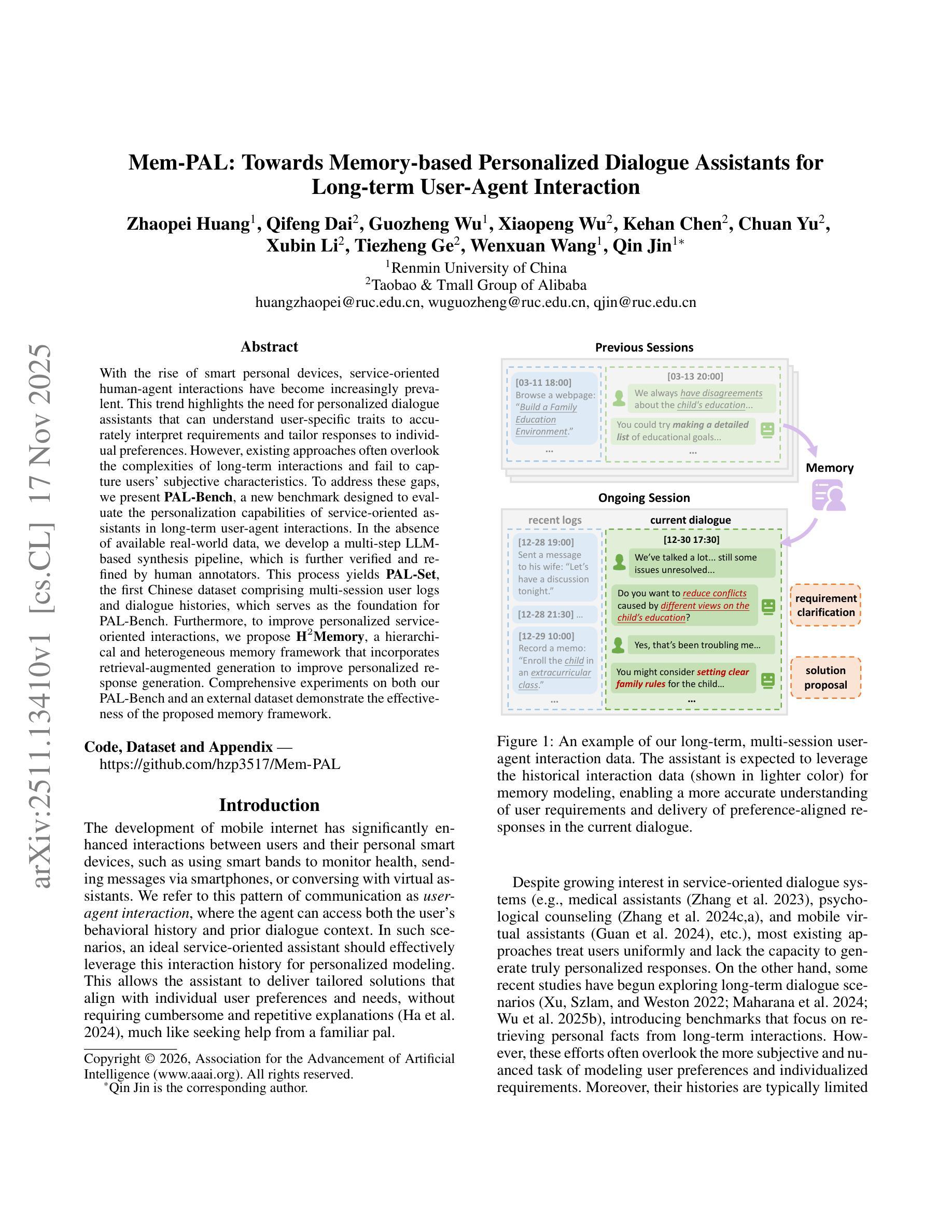 随着智能个人设备的普及,面向服务的智能人机交互变得越来越普遍。这一趋势凸显了需要能够理解用户特定特征的个性化对话助理,以准确解释需求并根据个人偏好定制响应。然而,现有方法往往忽略了长期交互的复杂性,无法捕捉用户的主观特征。为了解决这些差距,我们推出了PAL-Bench,这是一个新的基准测试,旨在评估面向服务的助理在长期用户代理交互中的个性化能力。在缺乏可用的真实世界数据的情况下,我们开发了一个多步骤的基于大型语言模型的合成管道,该管道经过人类注释者的验证和细化。这一过程产生了PAL-Set,这是首个包含多会话用户日志和对话历史的首个中文数据集,它作为PAL-Bench的基础。此外,为了改善面向个人的服务交互,我们提出了H$^2$Memory,这是一个分层和异构的内存框架,它结合了检索增强生成,以提高个性化响应生成。在我们自己的PAL-Bench和外部数据集上的综合实验表明,所提出的记忆框架是有效的。
