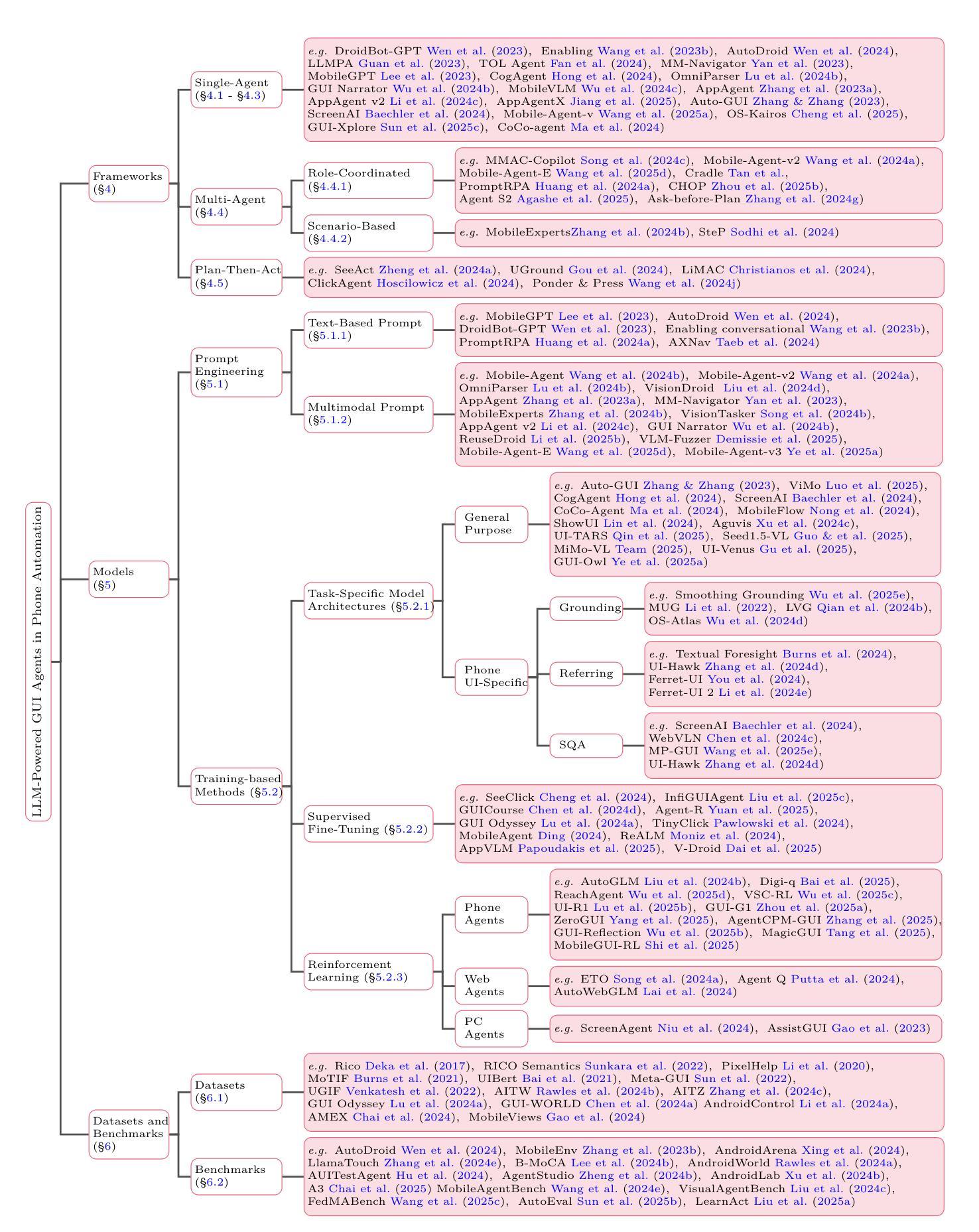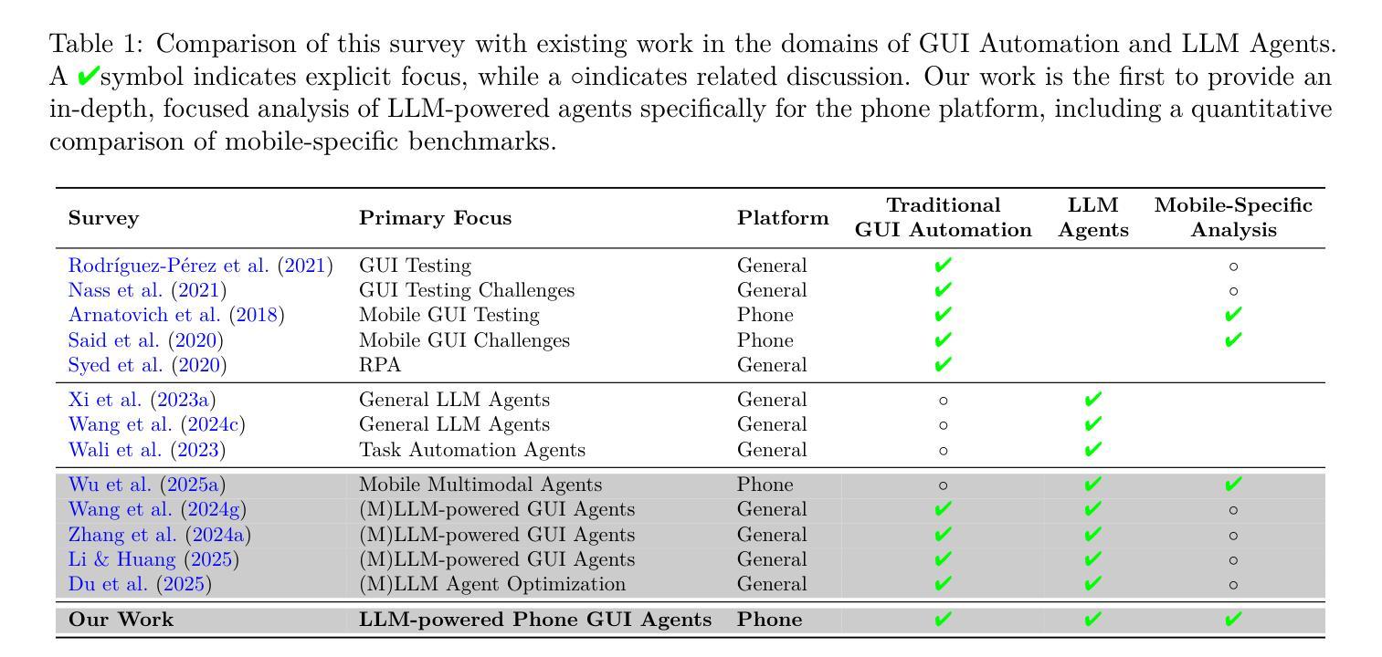 随着大型语言模型(LLM)的快速发展,电话自动化经历了深刻变革。本文全面回顾了LLM驱动的电话GUI代理,突出其从基于脚本的自动化向智能、自适应系统的演变。文章首先介绍了关键挑战,包括通用性有限、维护成本高以及意图理解薄弱,并展示了LLM如何通过高级语言理解、多模式感知和稳健决策来应对这些挑战。文章还提出了涵盖代理框架、建模方法、基本数据集和基准测试的税务分类,并详细描述了任务特定架构、监督微调以及强化学习策略,这些策略能够架起用户意图和GUI操作之间的桥梁。最后,文章讨论了数据集多样性、设备部署效率、用户中心适应性和安全顾虑等开放挑战,为这一快速演变领域提供了前瞻性的见解。