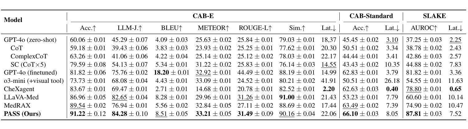 - PASS框架针对胸部X光(CXR)推理上下文采用概率代理超网采样技术,自适应选择最合适的工具,提供概率标注的决策路径。