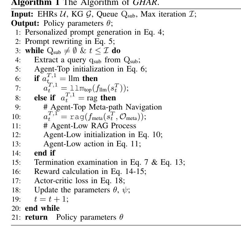 准确的医疗预测对于改善患者结果和降低运营成本至关重要。随着推理能力的不断增长,大型语言模型(LLM)凭借丰富的参数知识,为提升医疗预测提供了一条有前景的道路。然而,由于嵌入知识的可靠性和覆盖范围的局限性,LLM容易存在事实错误。虽然检索增强生成(RAG)框架,如GraphRAG及其变体,已经通过融入外部知识来缓解这些问题,但在医疗场景中,它们面临两个主要挑战:(1)确定激活检索机制的临床必要性;(2)实现检索器和生成器之间的协同,以构建符合上下文的检索。为了解决这些挑战,我们提出了GHAR,这是一种生成式分层代理增强RAG框架,可以同时解决何时检索以及如何优化医疗领域子模块之间的协作。具体来说,对于第一个挑战,我们设计了一个由Agent-Top和Agent-Low组成的双代理架构。Agent-Top作为主治医生,迭代地决定是依赖参数知识还是启动检索;而Agent-Low则作为咨询服务,在触发检索时总结所有任务相关知识。为了解决第二个挑战,我们创新地将两个代理的优化统一在一个正式的马尔可夫决策过程中,设计各种奖励来对齐他们准确预测的共同目标,同时保持他们各自独特的角色。在三个流行任务的三个基准数据集上的大量实验表明,我们的方法在先进基线之上具有优越性,突显了分层代理增强RAG在推进医疗系统方面的潜力。