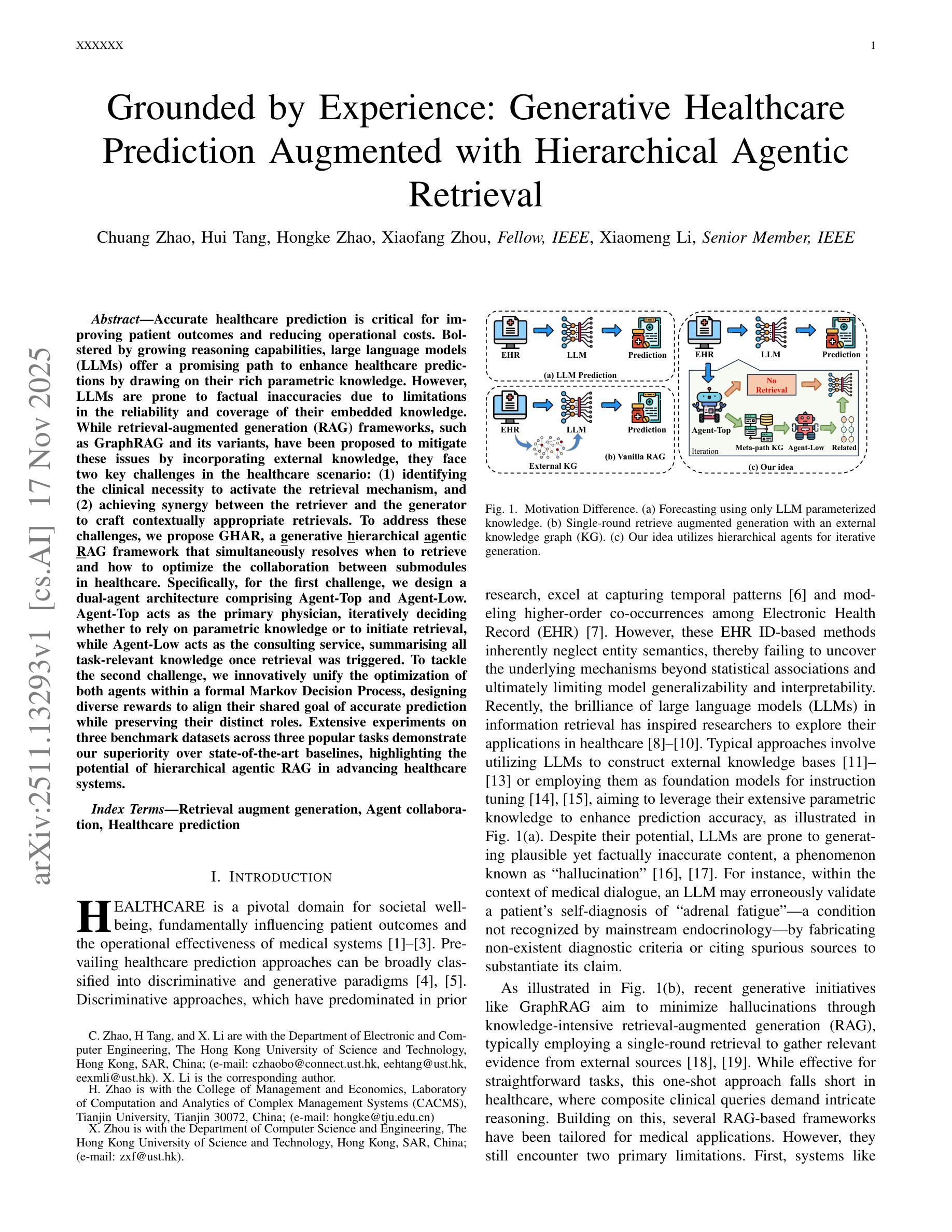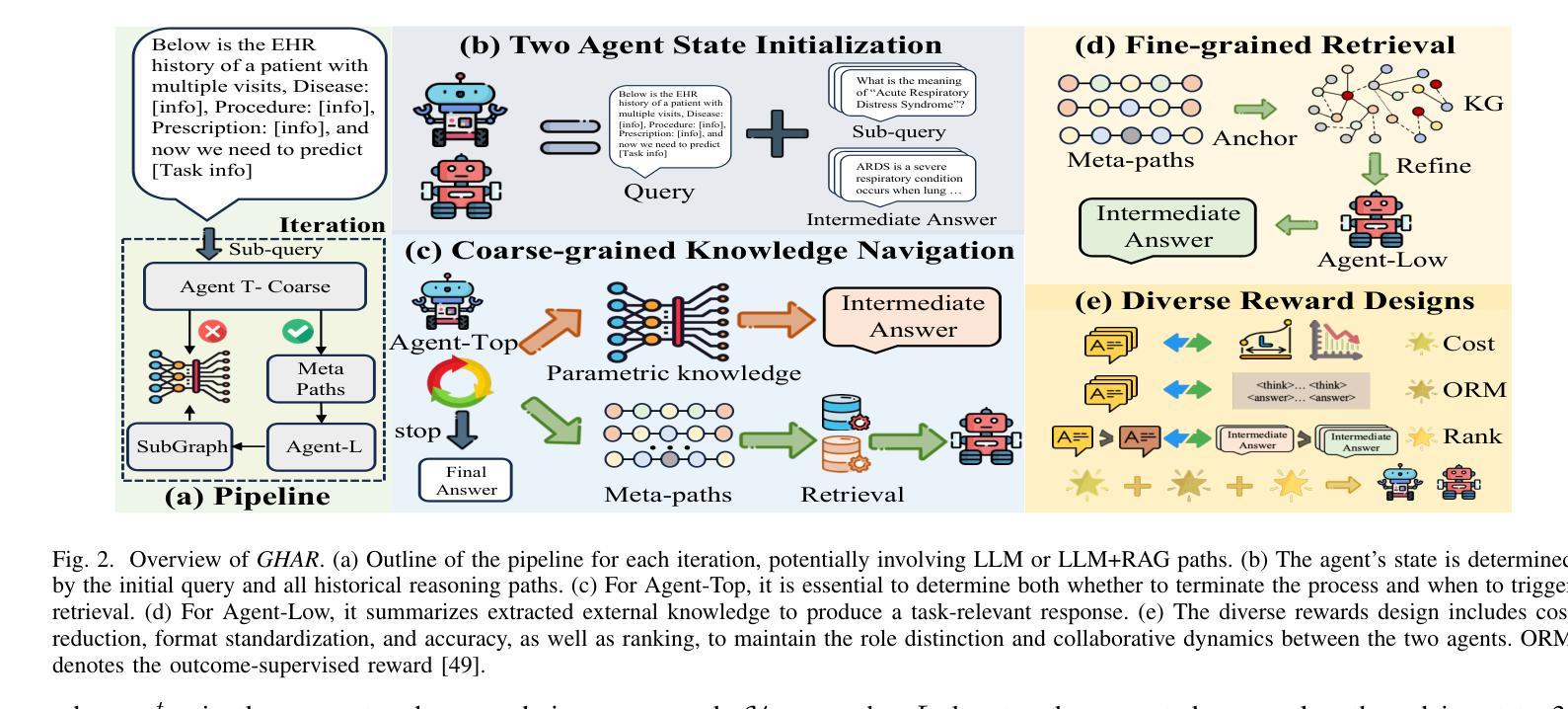 基于大型语言模型(LLM)的丰富参数知识,其在医疗保健预测中展现出巨大潜力,有助于改善病患结果并降低运营成本。然而,LLM存在事实不准确的问题,其嵌入知识的可靠性和覆盖面有限。为解决此问题,研究者提出了检索增强生成(RAG)框架如GraphRAG及其变体来融入外部知识。然而,在医疗保健场景中,RAG面临两大挑战:一是确定何时启动检索机制的临床必要性,二是实现检索器和生成器之间的协同合作以生成符合语境的检索结果。为解决这些挑战,本文提出了GHAR,一个生成式分层代理增强RAG框架,旨在解决何时检索以及如何优化子模块协同的问题。GHAR设计了一个双代理架构并创新性地将其统一到一个正式的马尔可夫决策过程中,以优化两个代理的性能并使其目标一致。实验证明GHAR在三个基准数据集上的表现优于现有技术,显示出其在医疗保健系统中提升预测准确性的潜力。
