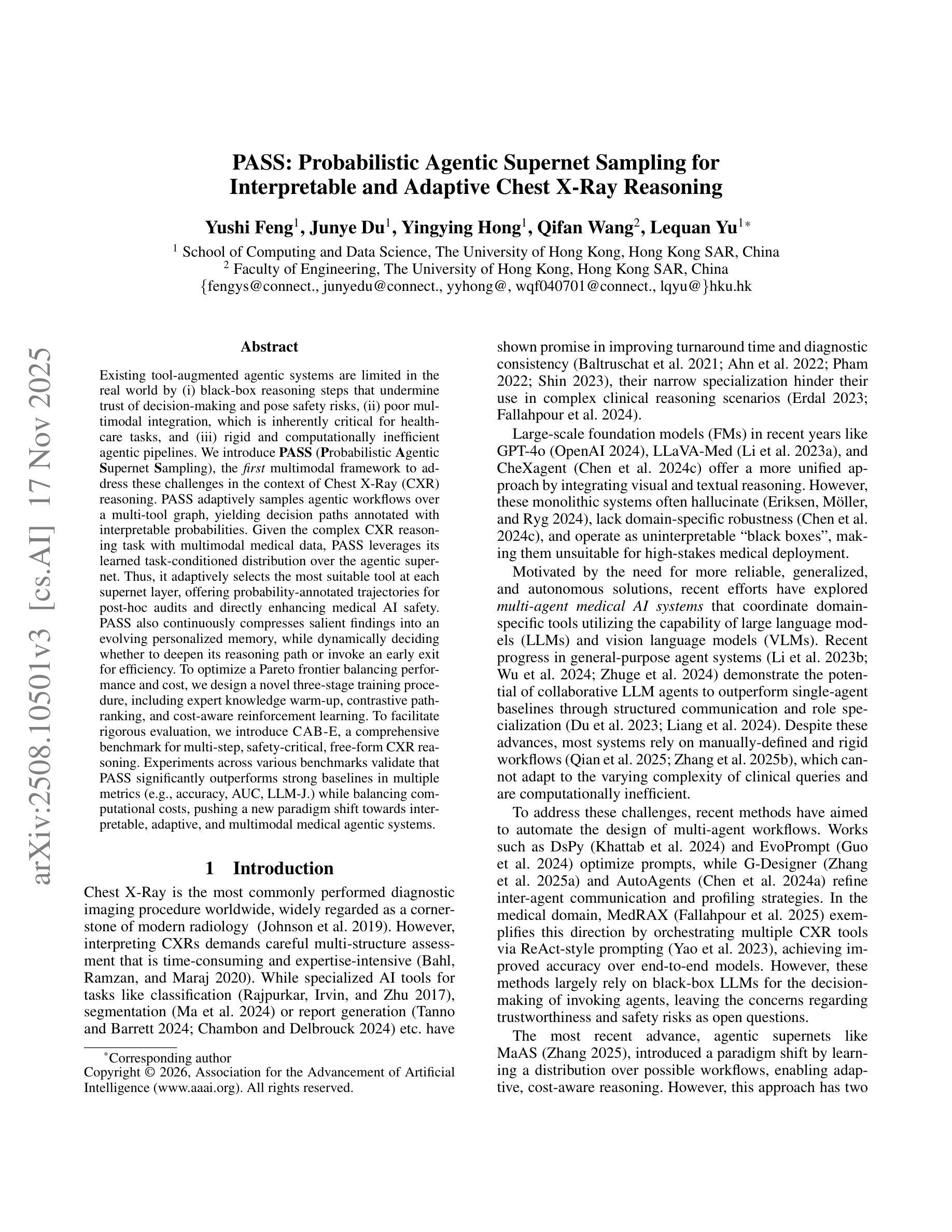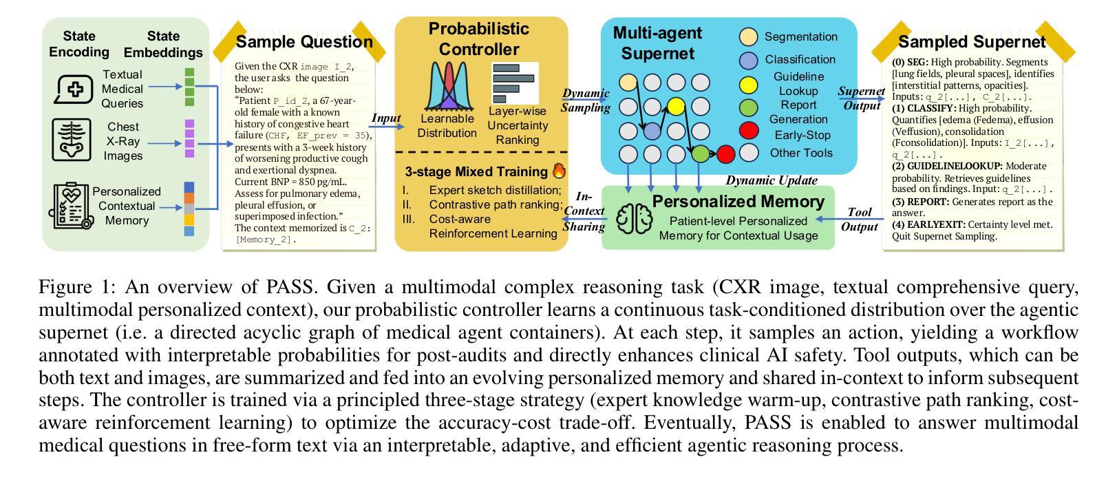 现有工具增强型智能体系统在现实世界中的应用存在局限性,主要包括(i)黑箱推理步骤损害了决策的可信度并带来安全风险,(ii)缺乏良好的多模式集成,这对医疗任务来说至关重要,(iii)智能管道刚性且计算效率低下。我们推出PASS(概率智能体超网采样),这是针对胸部X射线(CXR)推理中这些挑战的第一个多模式框架。PASS自适应地在多工具图上采样智能体工作流程,产生带有可解释概率的决策路径。针对具有多模式医疗数据的复杂CXR推理任务,PASS利用其在智能体超网上的学习到的任务条件分布。因此,它可以在每个超网层上自适应地选择最合适的工具,为事后审计提供概率注释轨迹,并直接提高医疗人工智能的安全性。PASS还会不断将重要发现压缩成不断发展的个性化记忆,同时动态决定是深化其推理路径还是提前退出以提高效率。为了优化平衡性能和成本的帕累托前沿,我们设计了一种新型的三阶段训练程序,包括专家知识预热、对比路径排名和成本感知强化学习。为了进行严格评估,我们引入了CAB-E,这是一个用于多步、安全关键的自由形式CXR推理的综合基准测试。在多种基准测试上的实验证明,PASS在多个指标(例如准确性、AUC、LLM-J)上显著优于强大的基线,同时平衡了计算成本,朝着可解释、自适应和多模式医疗智能体系统的新范式转变。