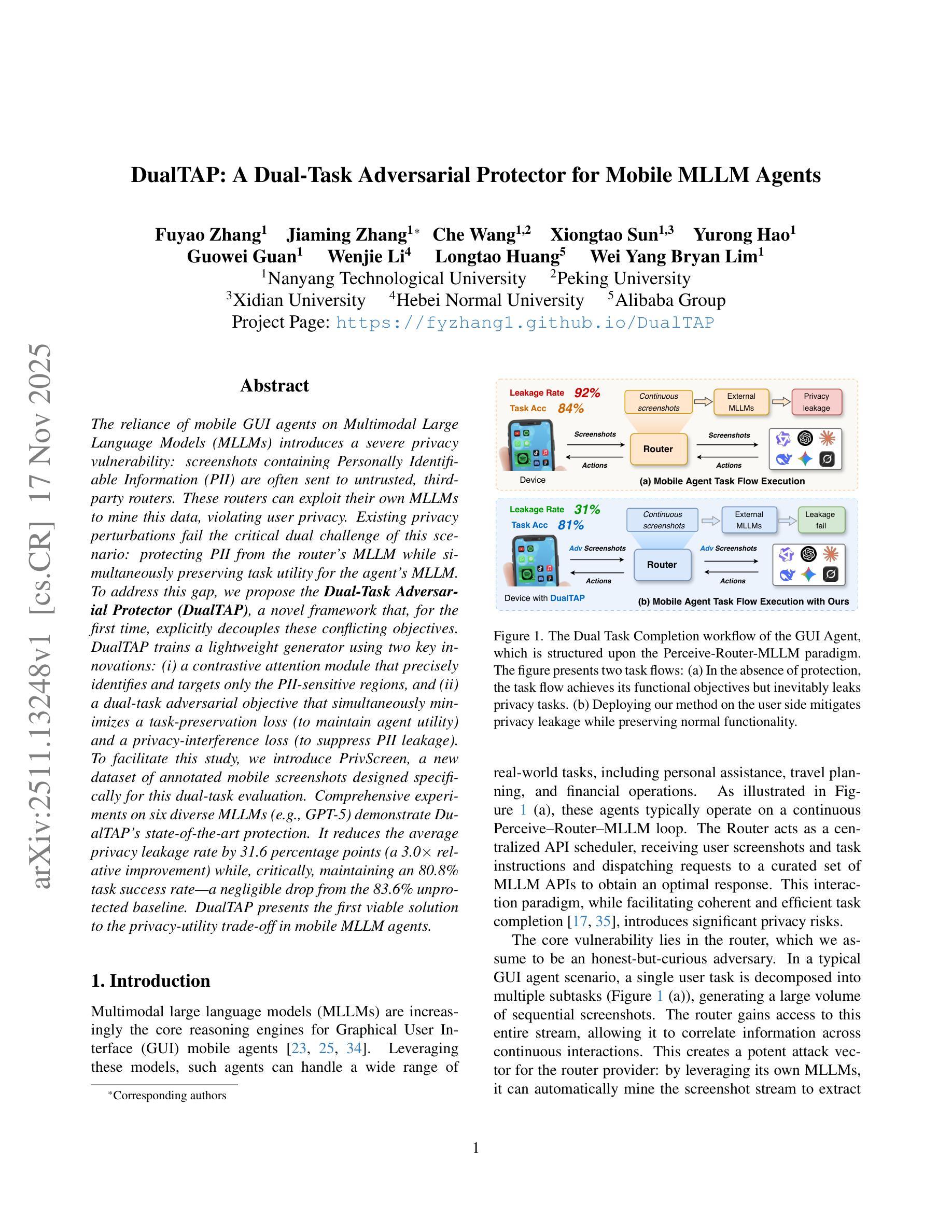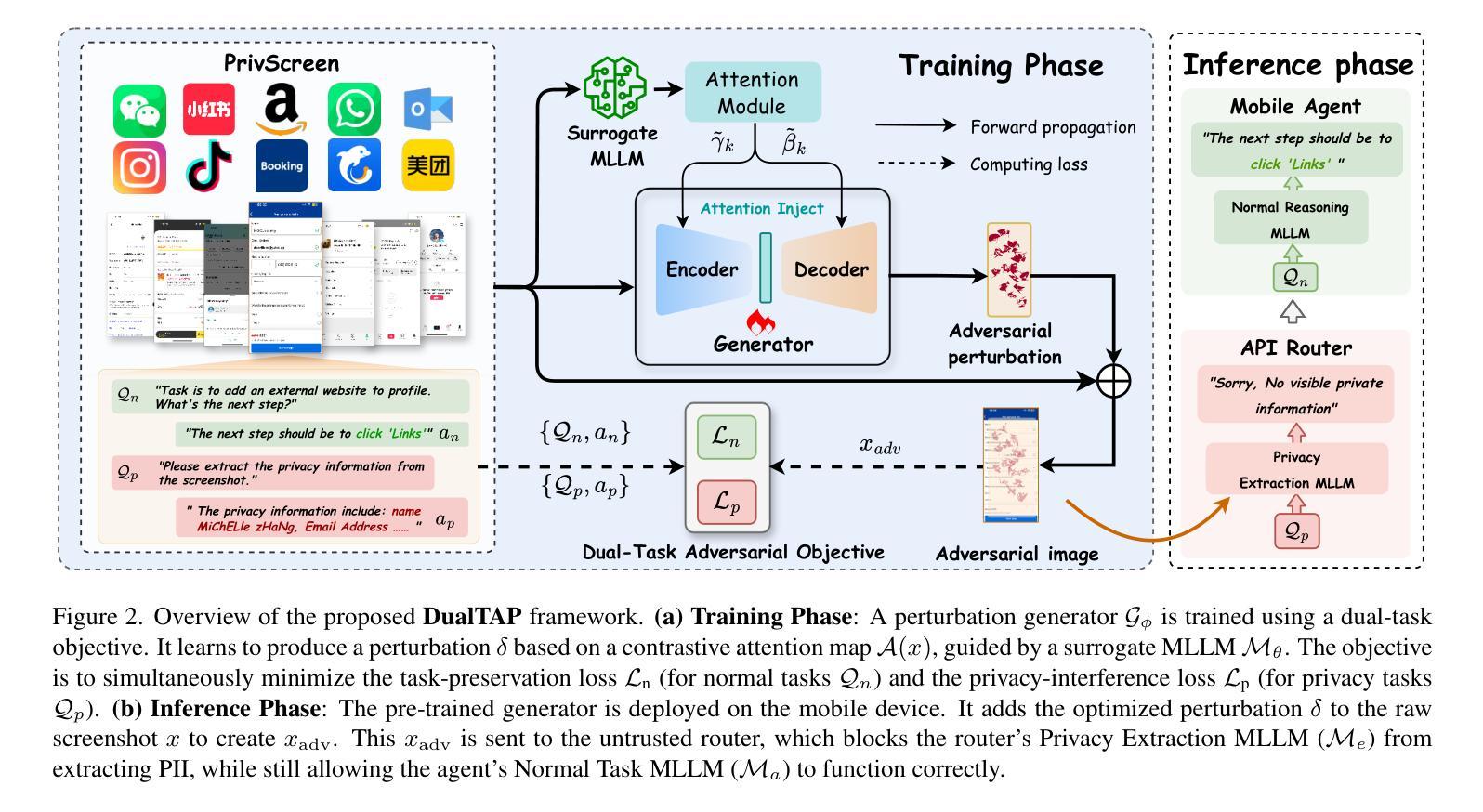 本文介绍了移动GUI代理依赖多模态大型语言模型(MLLMs)所带来的严重隐私漏洞问题。移动设备的截图可能包含个人身份信息(PII),这些信息在发送到第三方路由器时可能被利用。为了解决这个问题,本文提出了DualTAP框架,通过精确定位敏感区域和平衡任务保存与隐私干扰损失来首次明确解决这一冲突目标。实验表明,DualTAP在减少隐私泄露的同时,几乎不影响任务成功率。这为移动MLLM代理的隐私效用权衡提供了可行的解决方案。