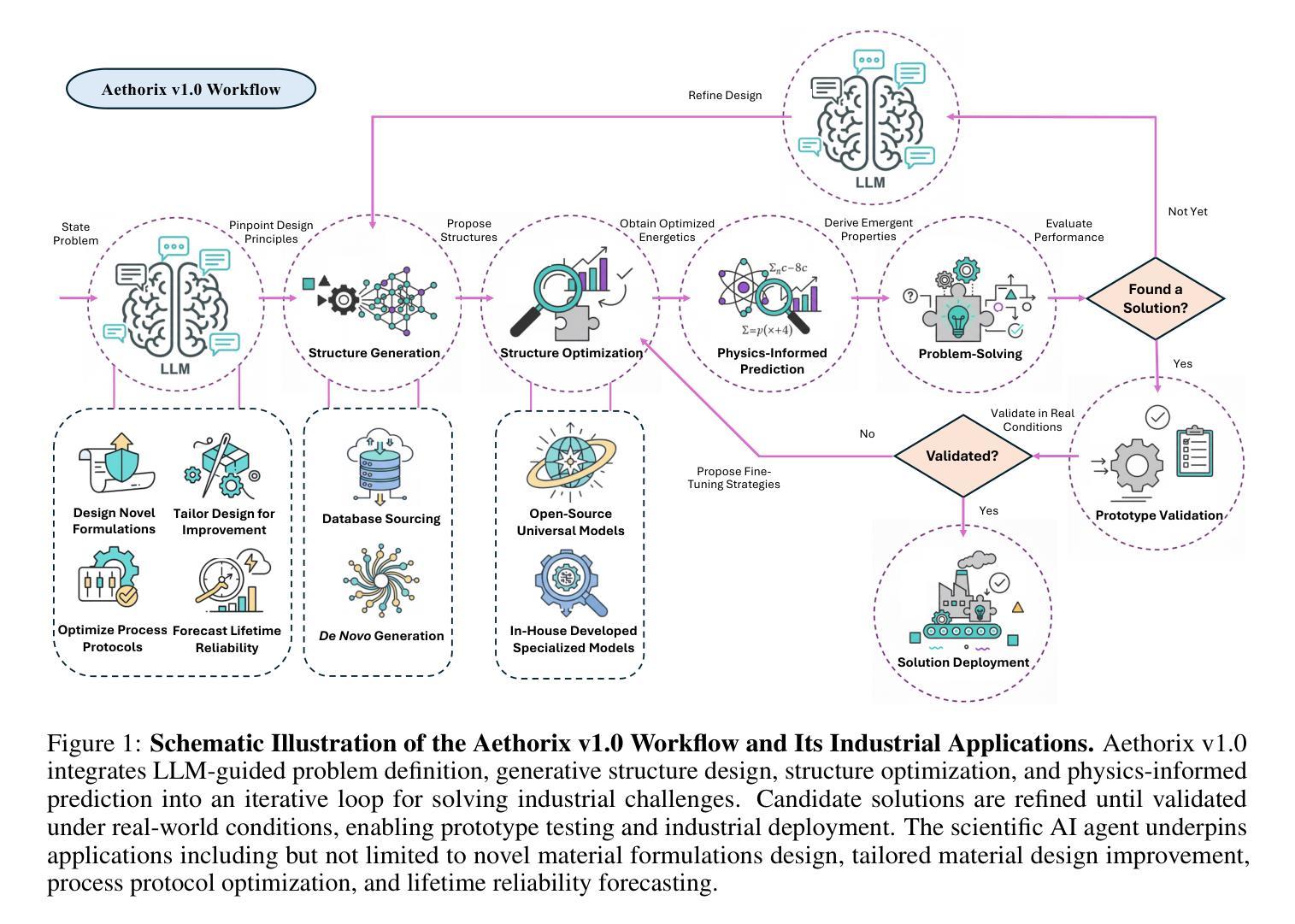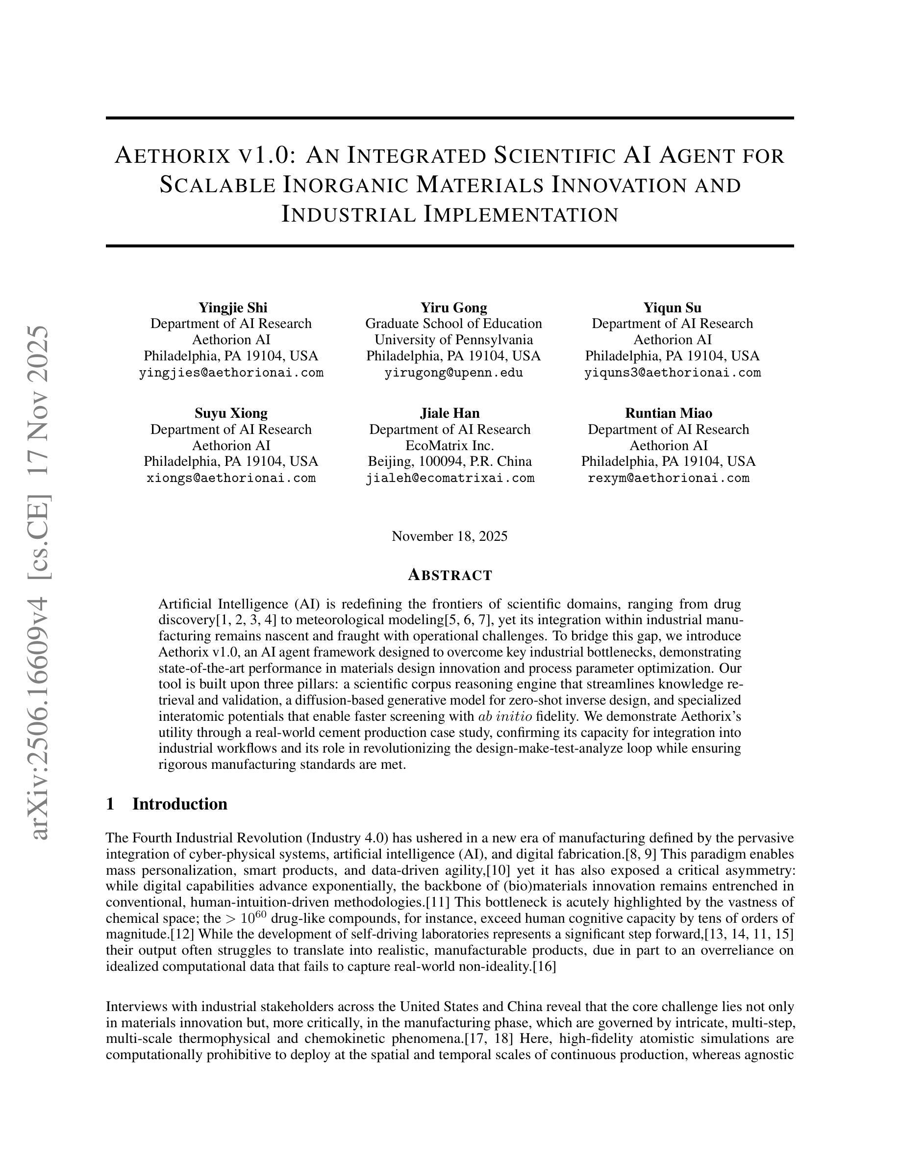 人工智能(AI)正在重新定义科学领域的边界,从药物发现到气象建模,然而其在工业制造中的整合仍处于初级阶段,并面临着操作挑战。为了弥补这一差距,我们推出了Aethorix v1.0,这是一款人工智能代理框架,旨在克服工业瓶颈,在材料设计创新和工艺参数优化方面展现出卓越的性能。我们的工具建立在三大支柱之上:一个简化知识检索和验证的科学语料推理引擎,一个基于扩散的生成模型,用于零样本逆向设计,以及特殊的原子间势能,可实现与从头算精度更快的筛选。我们通过现实世界的水泥生产案例研究展示了Aethorix的实用性,证实了其融入工业工作流程的能力及其在革命设计-制造-测试-分析循环中的作用,同时确保满足严格的制造标准。