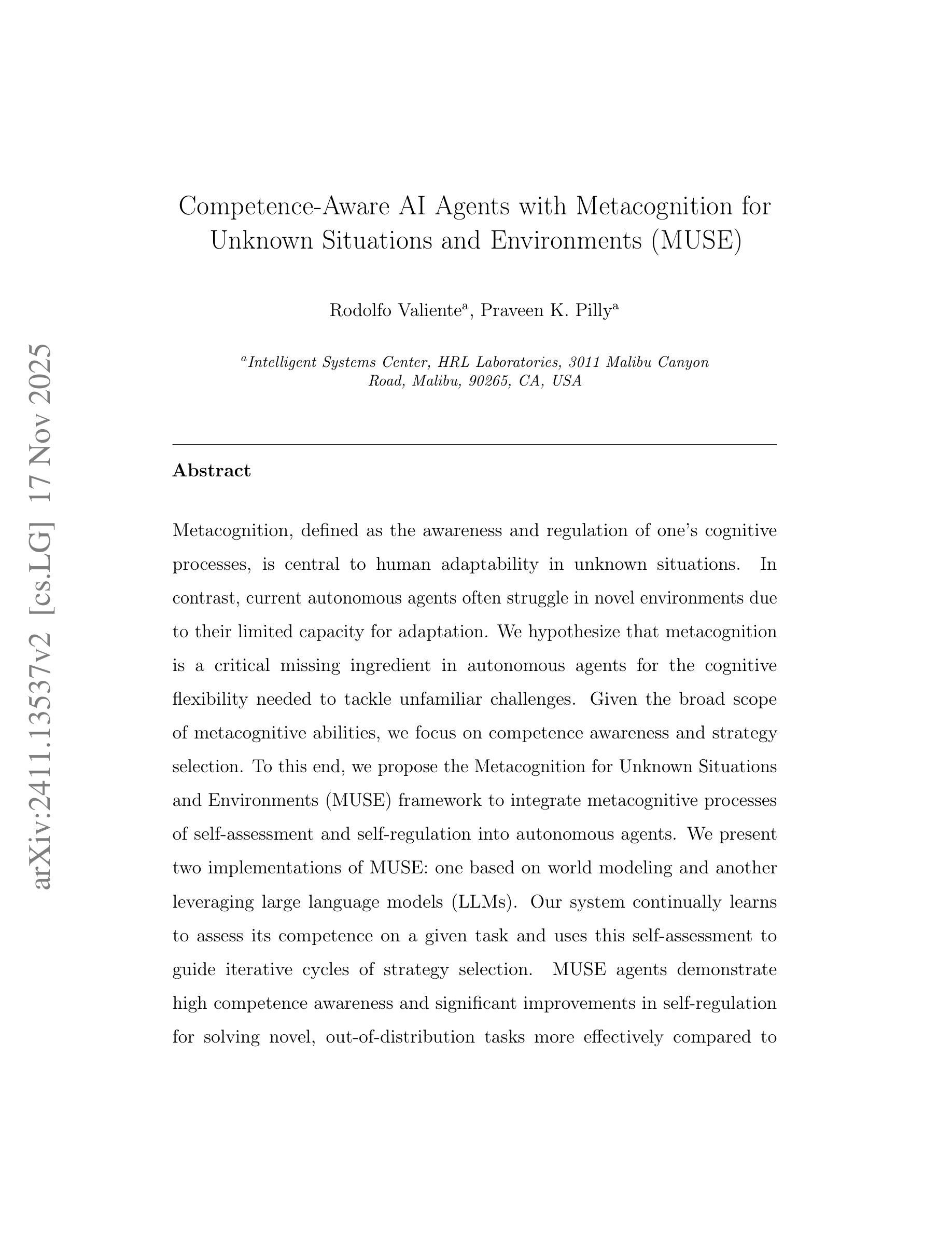 - 提出面向未知情境和环境(MUSE)的框架,旨在增强自主代理人的元认知能力,包括自我评估和策略选择等。
