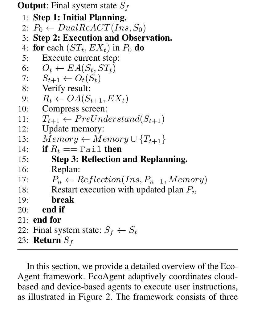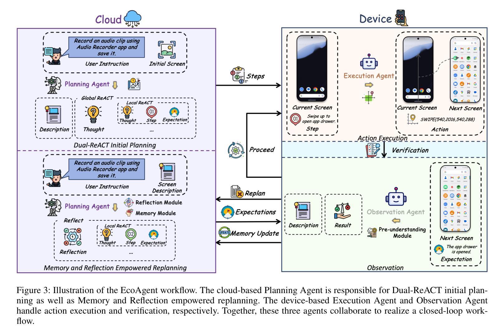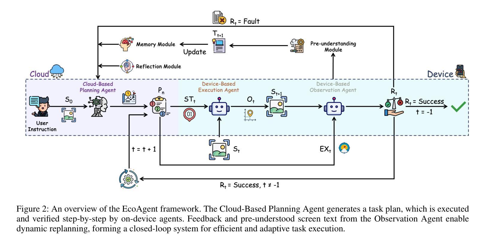 - EcoAgent框架结合了云规划智能体和设备观测智能体以实现隐私感知的移动自动化。