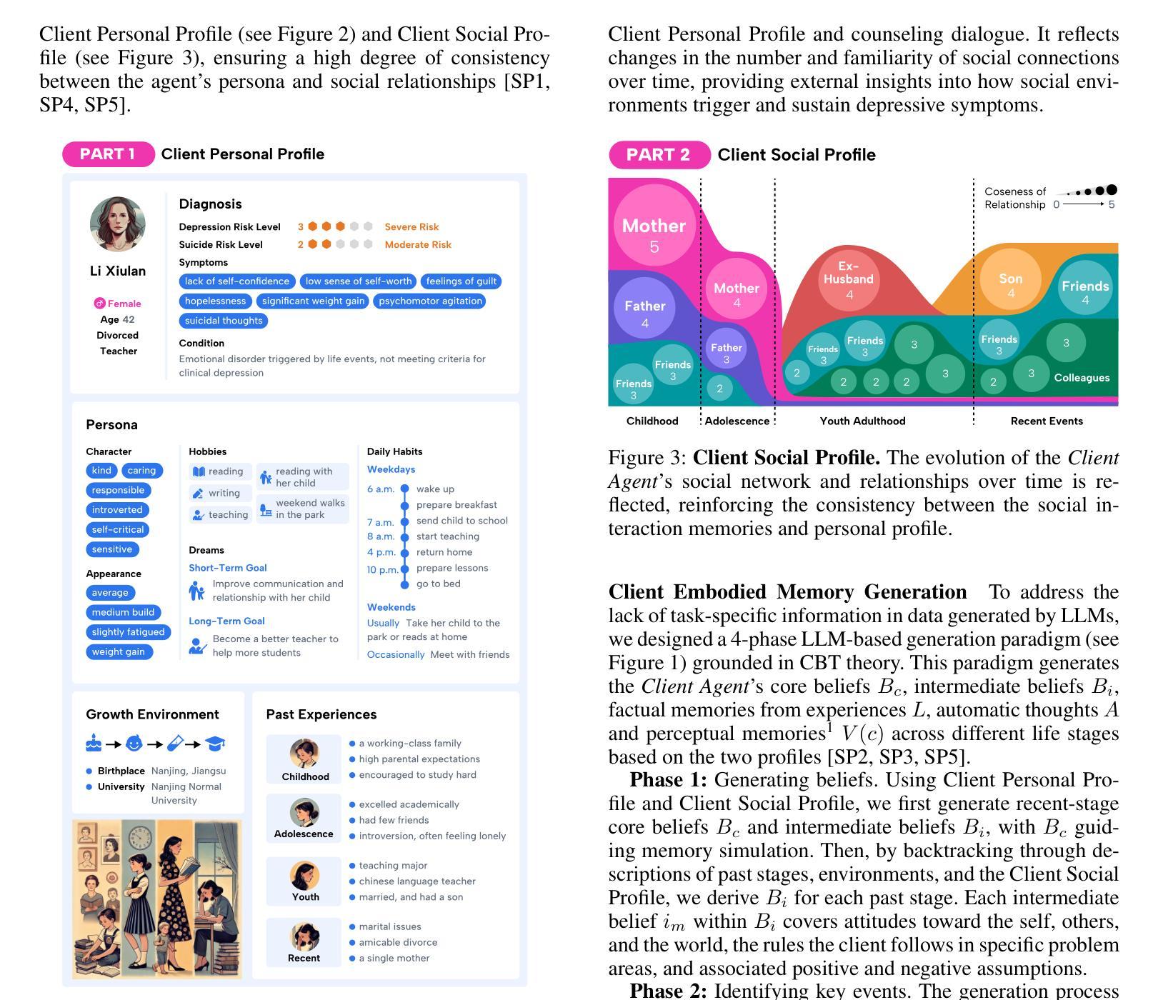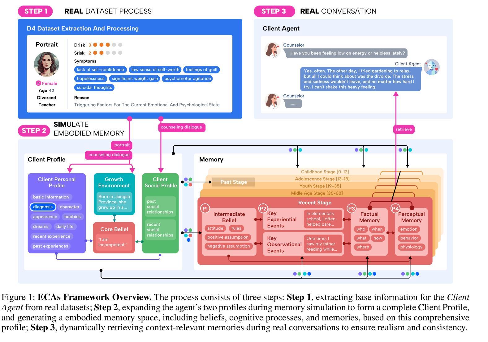 基于隐私考量,心理健康领域的开放对话数据集主要通过人工或AI合成方法生成。然而,由于心理过程的隐性特质,尤其是客户的心理过程,为合成数据的真实性和多样性带来挑战。本文提出ECAs(Embodied Conversational Agents)框架,基于大型语言模型(LLMs)的具身代理模拟,并融入多个心理学理论原则。通过模拟,我们扩展真实咨询案例数据,建立一个微妙的具身认知记忆空间,并根据高频率咨询问题生成对话数据。实验验证显示,我们的框架在模拟真实性和必要性方面显著优于基线方法。