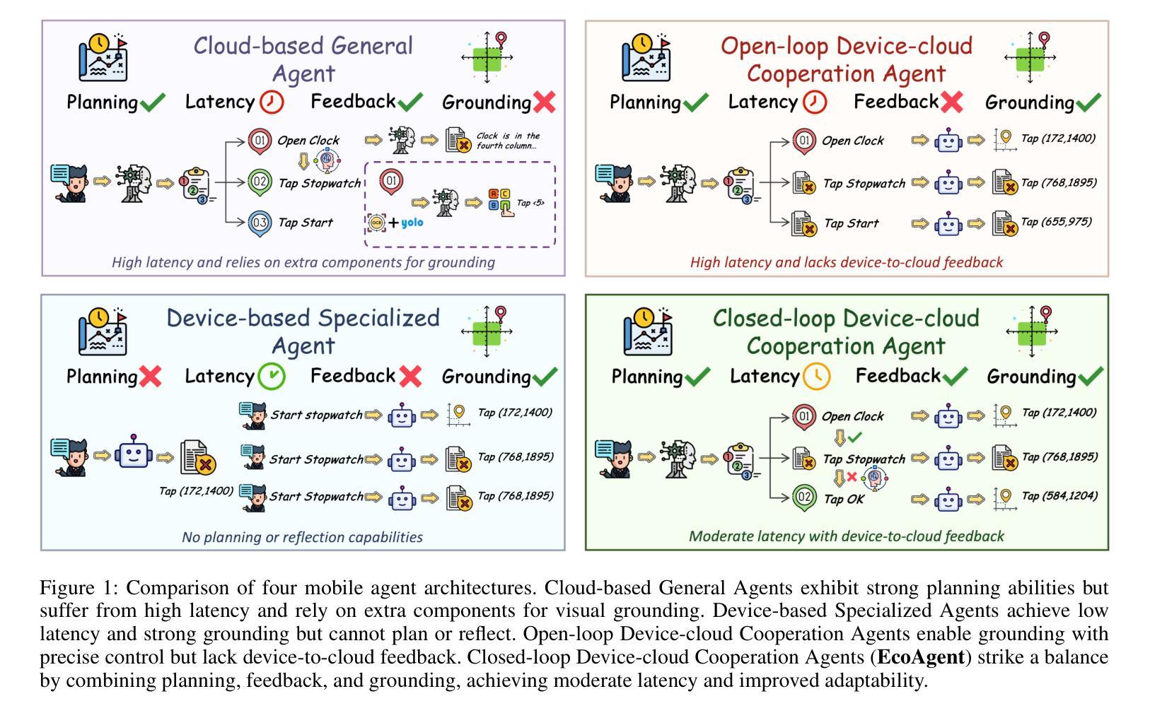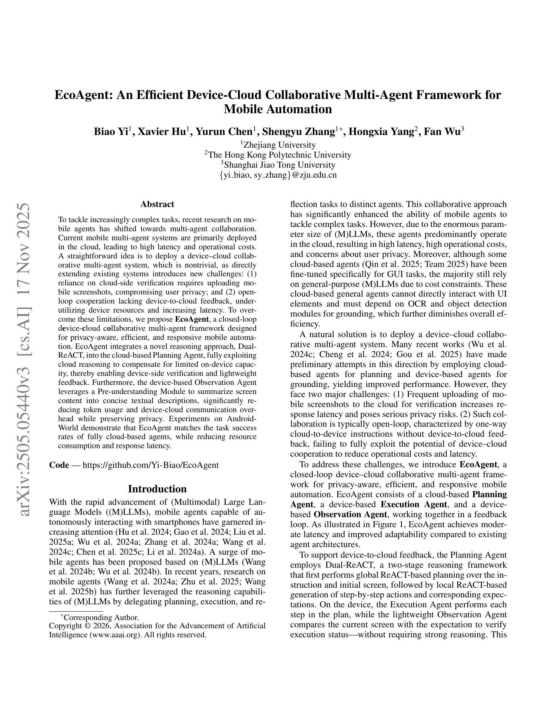 移动多智能体系统面临复杂任务挑战,当前主要部署在云端,导致高延迟和运营成本。为克服这些限制,提出EcoAgent框架,采用设备云协同合作方式,集成云规划智能体和设备观测智能体,实现隐私感知、高效和响应迅速的移动自动化。新提出一种推理方法——Dual-ReACT,能充分利用云推理来弥补设备容量的局限,并实现设备端验证和轻量级反馈。此外,通过预理解模块将屏幕内容简化为简洁的文本描述,减少通信开销并保护隐私。实验证明EcoAgent在任务成功率上匹配全云智能体,同时降低资源消耗和响应延迟。