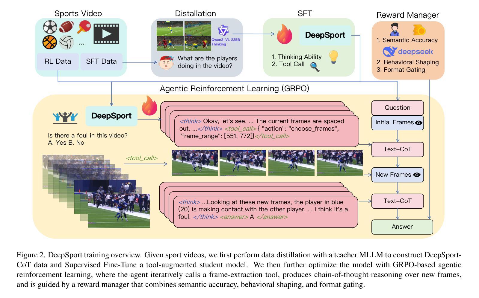 - DeepSport通过数据蒸馏管道合成高质量的思考轨迹数据,并采用两阶段训练策略进行优化。