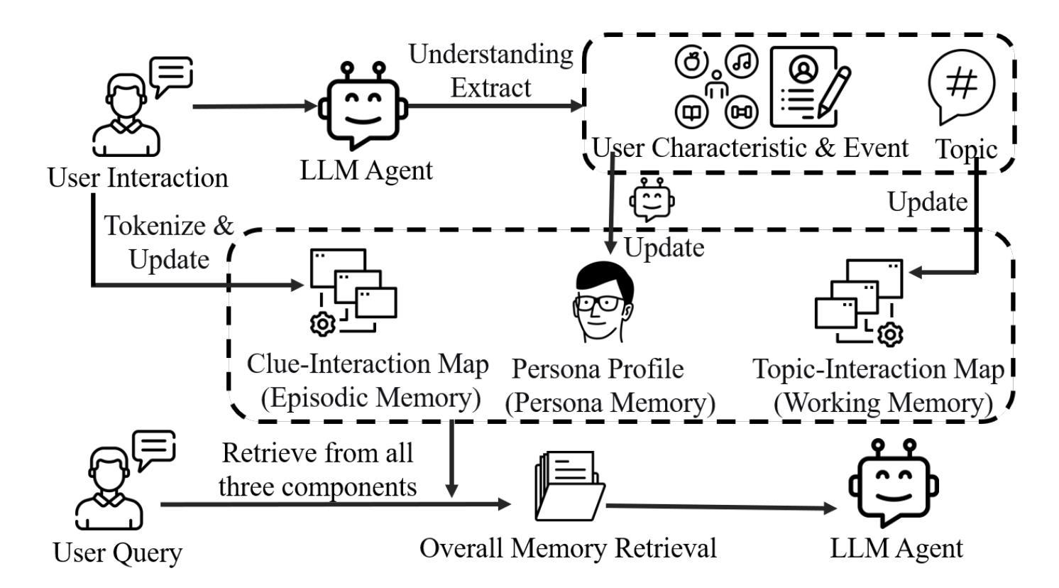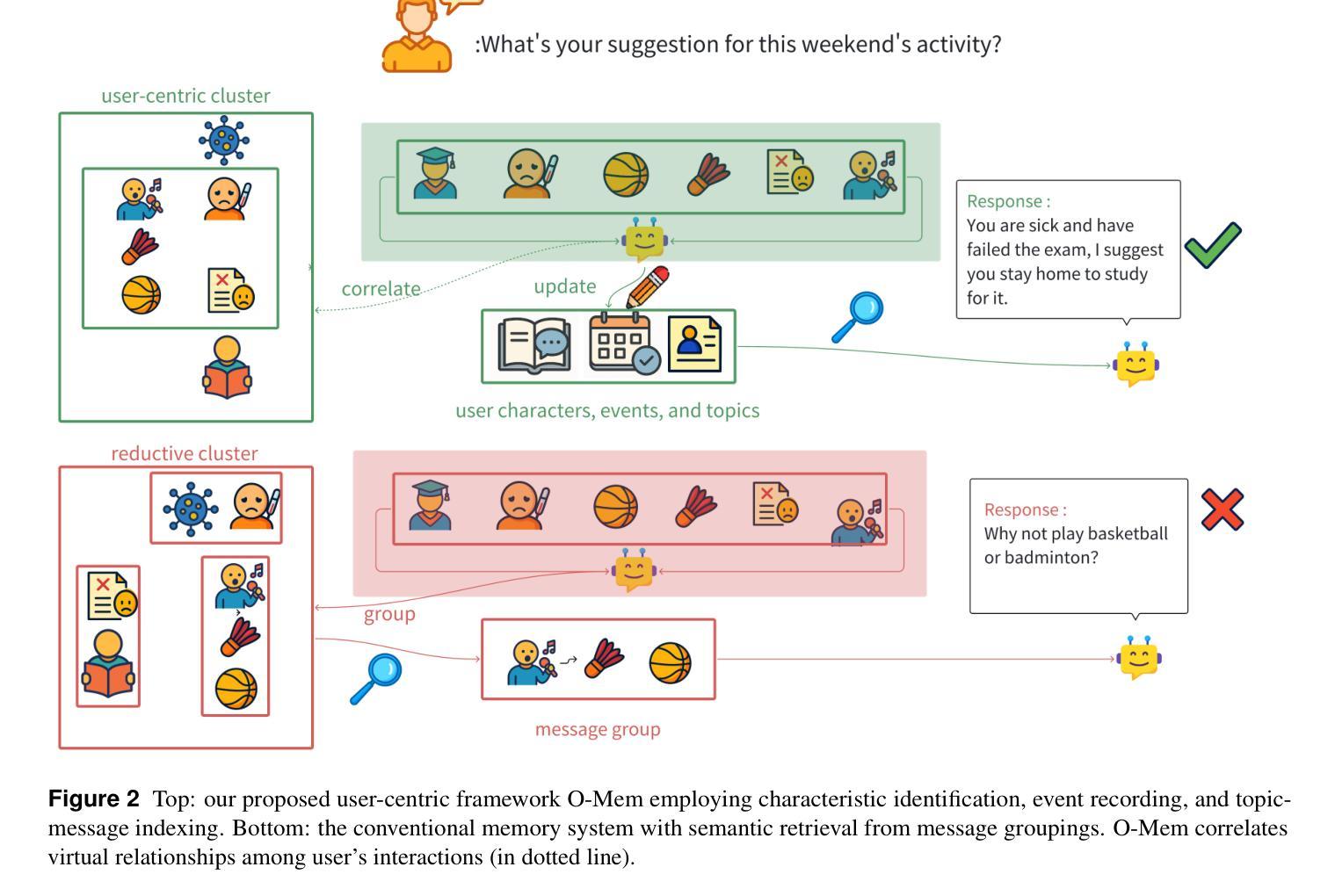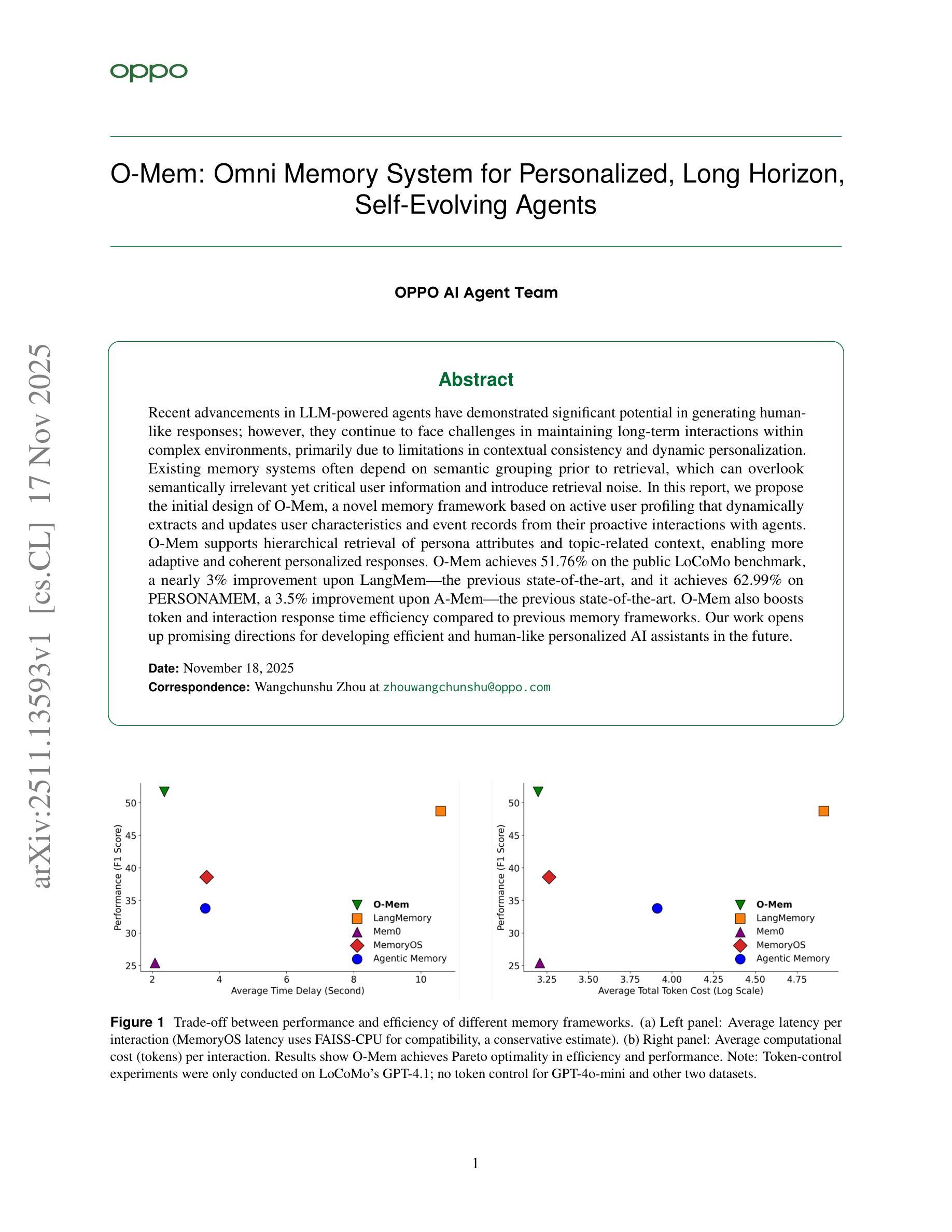 近期,以大型语言模型(LLM)驱动的代理人的进展,在生成人类响应方面展现了巨大的潜力。然而,它们在复杂环境中维持长期互动方面仍面临挑战,这主要归因于上下文一致性和动态个性化的局限性。现有的记忆系统通常依赖于检索前的语义分组,这可能会忽略用户语义上无关紧要但至关重要的信息,并引入检索噪音。在本报告中,我们提出了O-Mem的初步设计,这是一种基于主动用户分析的新型记忆框架,它动态提取和更新用户特性和事件记录,这些特性和记录来自用户与代理人的主动互动。O-Mem支持人格属性分层检索和主题相关上下文,从而实现更自适应和连贯的个性化响应。O-Mem在公共LoCoMo基准测试中达到了51.7 进展尤为突出:较之前最先进的LangMem提升了近百分之三(实现了得分百分比达到五十七),并且在PERSONAMEM上也取得了比此前的冠军框架A-Mem高出了三分的进步,因此推进了对精准化和个性化的回应,从更高效率提升反应速度的角度来看也比之前大多数的基准框架更好。我们的工作为未来开发高效且人性化的个性化人工智能助手指明了方向。