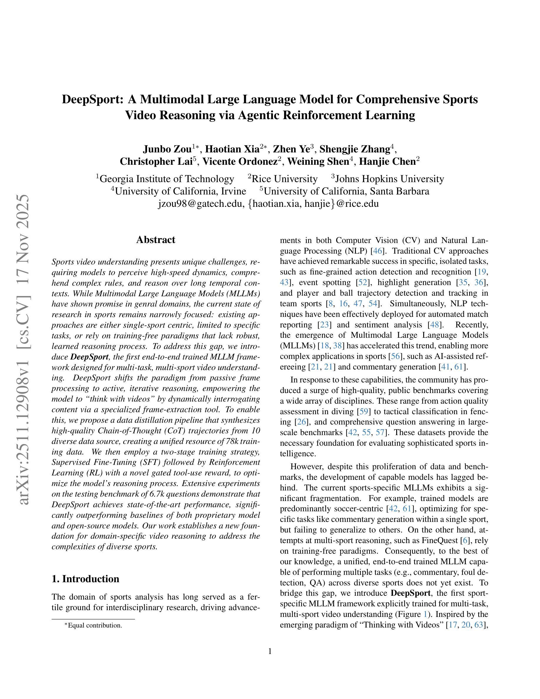 - DeepSport是首个为多任务、多运动视频理解设计的端到端训练的多模态大型语言模型框架。