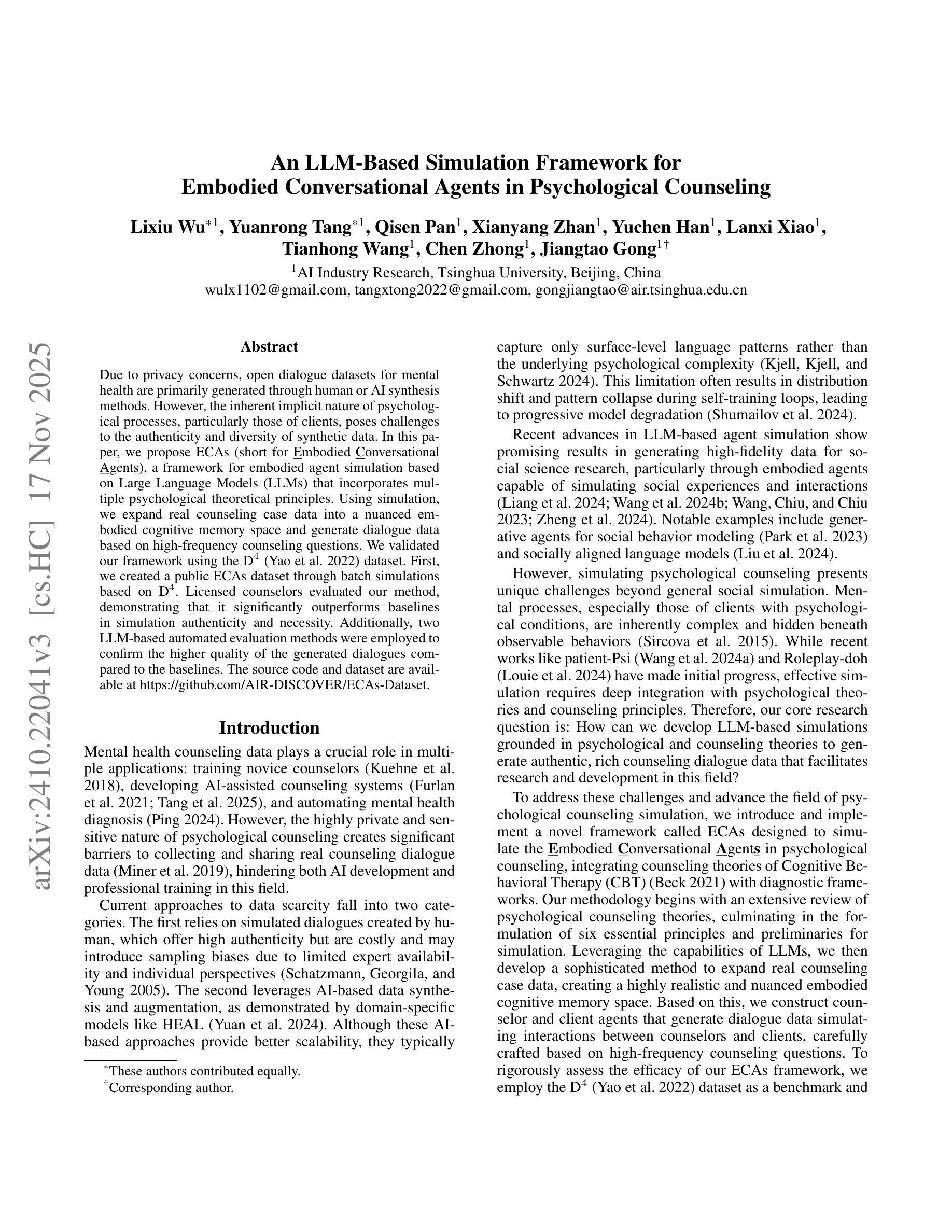 鉴于隐私问题,心理健康领域的开放对话数据集主要通过人工或AI合成方法生成。然而,心理过程(尤其是客户的心理过程)的固有隐含性质给合成数据的真实性和多样性带来了挑战。在本文中,我们提出ECAs(基于大型语言模型的实体对话代理,Embodied Conversational Agents),这是一个基于实体代理模拟的框架,融入了多个心理学理论原则。通过模拟,我们将真实的心理咨询案例数据扩展到一个微妙的实体认知记忆空间,并根据高频咨询问题生成对话数据。我们使用D4数据集验证了我们的框架。首先,我们基于D4通过批量模拟创建了一个公共ECA数据集。许可的心理咨询师对我们的方法进行了评估,结果表明,我们的方法在模拟真实性和必要性方面显著优于基准线。此外,还采用了两种基于大型语言模型的自动化评估方法,以确认生成的对话质量高于基准线。源代码和数据集可在https://github.com/AIR-DISCOVER/ECAs-Dataset获得。